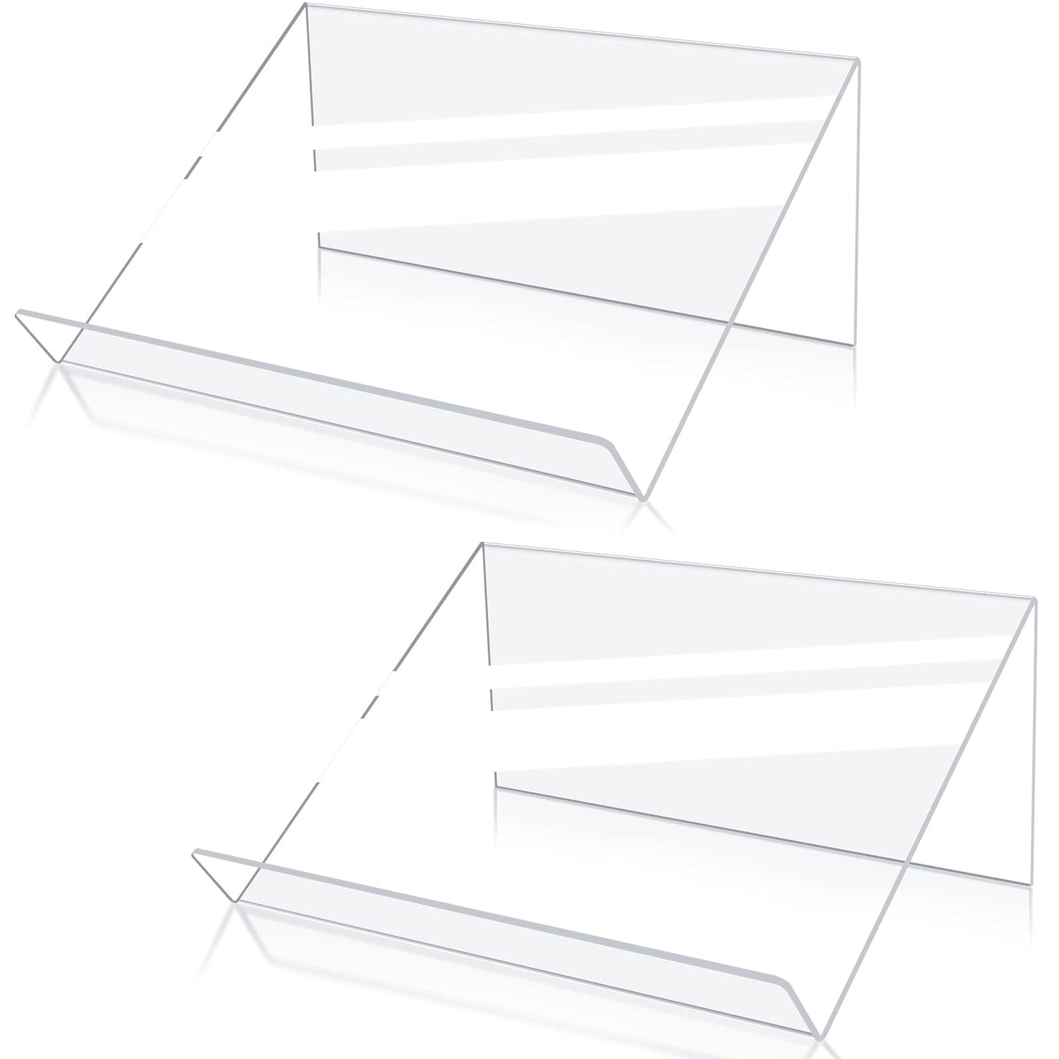 Kamehame Book Stands for Display, 2 Pack Slightly Elevated Clear Acrylic Book Display Stand with 1.5" Ledge, Book Easel Anti-slip Border for Handwriting Reading Art and Laptop, 12"x8.5"x5.1"