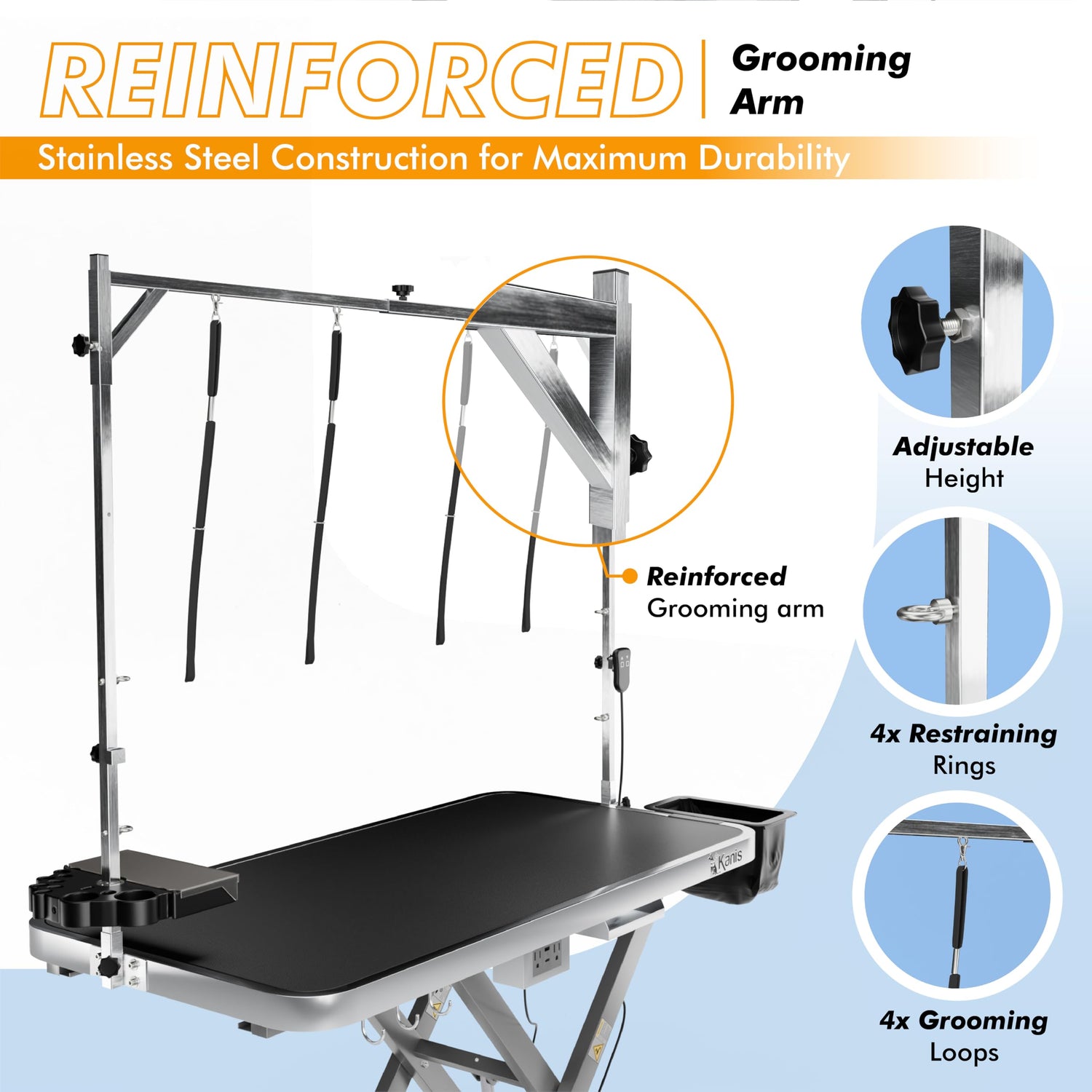 - PRACTICAL DESIGN & ALL ACCESSORIES INCLUDED - Having all your grooming equipment at your hand saves time and makes your grooming area tidy, organized, and always ready for use. The stainless steel frame of the adjustable table coupled with a reinforced grooming arm makes our trimming table stable, secure, and ideal for Commercial Use & Home Grooming.