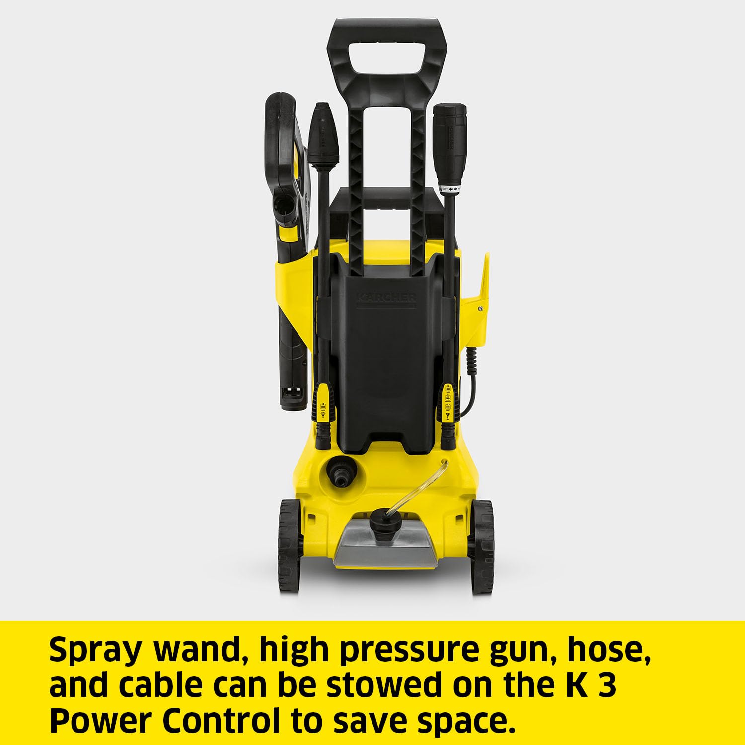 Details: Make light work of the toughest tasks with the Karcher K 3 Power Control electric pressure washer. 1800 PSI - 2100 Max PSI! Using the Vario Power Spray Wand, with it's simple twist pressure adjustment, you can quickly switch between cleaning tasks. The patented DirtBlaster wand delivers a concentrated spray that quickly blasts away embedded grime from hard, non-painted home surfaces like brick and concrete. From rinsing away everyday mud from delicate paint work, to blasting off stubborn dirt from the patio, this pressure washer can tackle any task quickly and effectively. Effortlessly apply detergent and minimize your cleaning time by using the integrated detergent tank on the K 3. When you're finished cleaning, neatly store away the cable, 26 ft. high-pressure hose, and accessories on the pressure washer using the on-board storage. Easily transport your K 3 back into storage with the telescopic handle and two smooth running wheels. Always have Karcher on hand with the Karcher App - it contains everything you need to know, from setting up your pressure washer to step-by-step application guides. This durable pressure washer will give you outstanding performance for years to come.