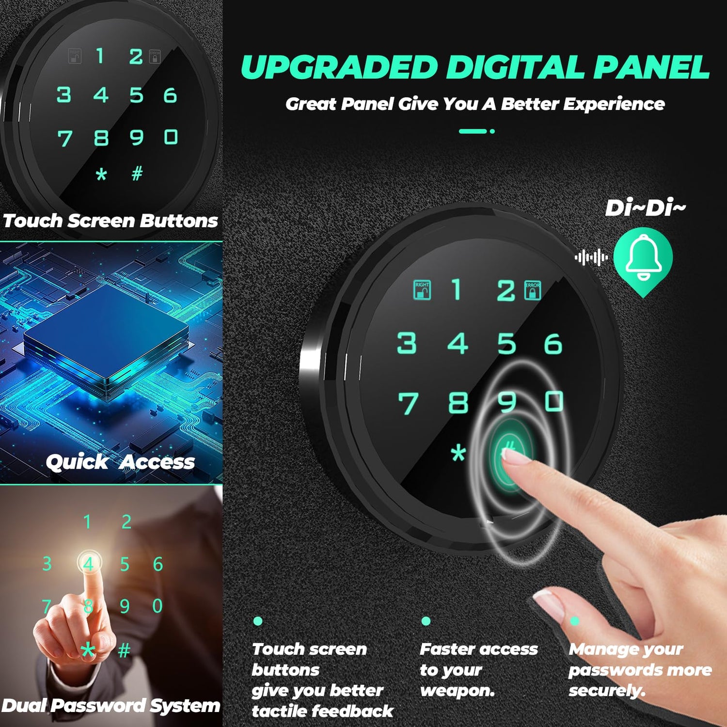 - 【Silent and Lock Function + LED Light】: Silent mode increases concealment; 5 consecutive incorrect fingerprint and password input, the system will be locked for 1 minute, the password function can not be used during the lock, you can only use the emergency key to enter the gun safe; When you enter the gun safe by password is, the LED light will be on to provide illumination at night