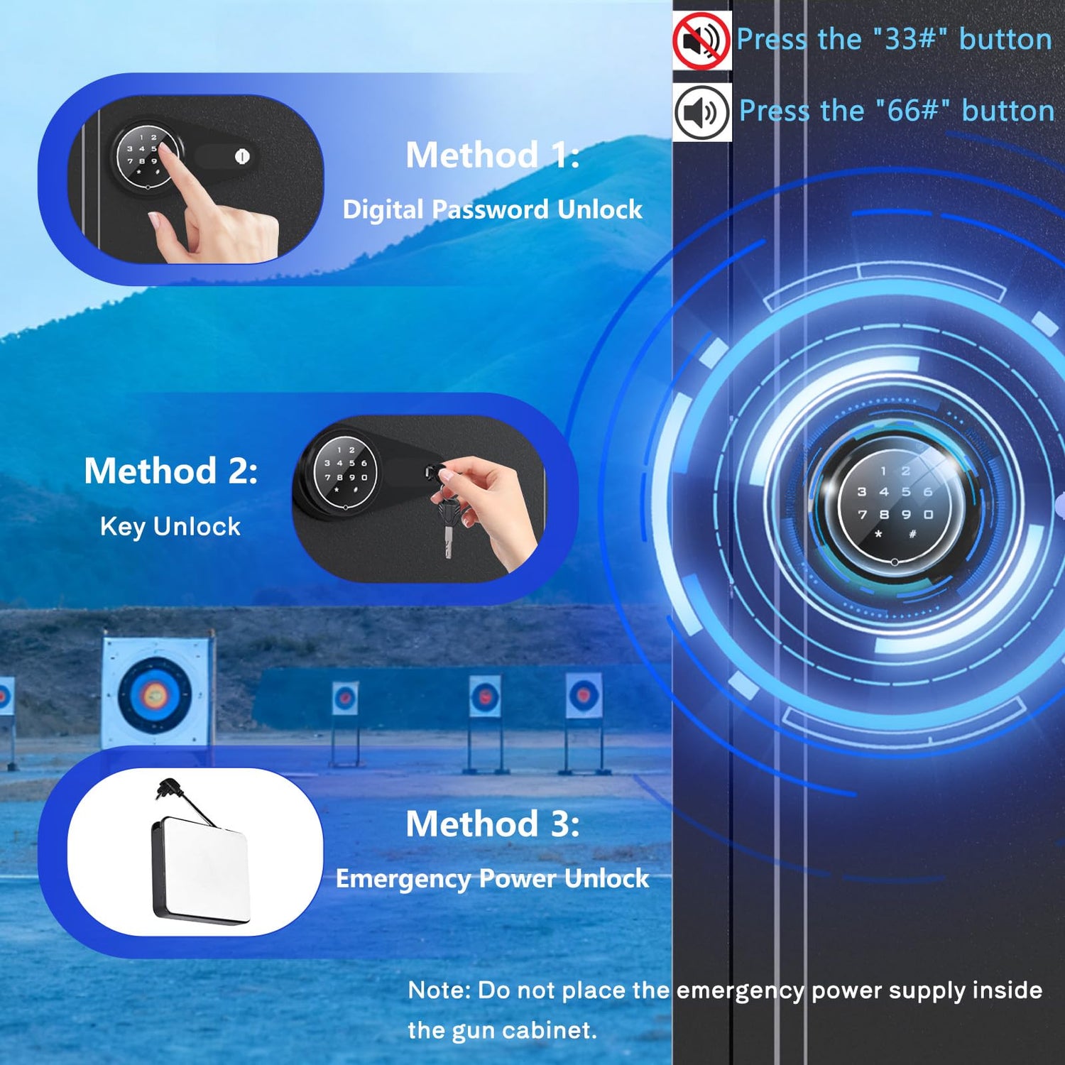 - Electronic Gun Safe with Silent System: As a modern rifle safe, it features an electronic combination lock, allowing for quick access to firearms without keys during emergencies. If the batteries run out, simply unlock the door with the key or emergency power, replace the 4 AA batteries, and the electronic lock is ready to use again. The keyboard lock switches freely between silent and normal modes to meet your varying needs.