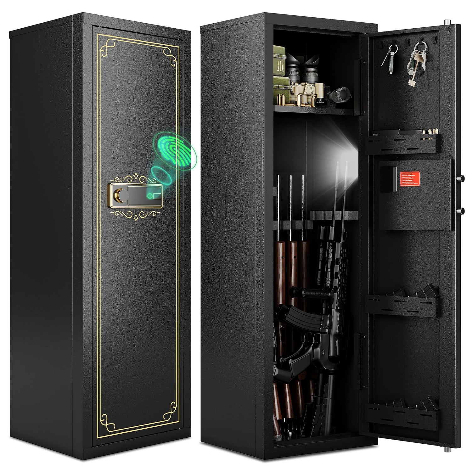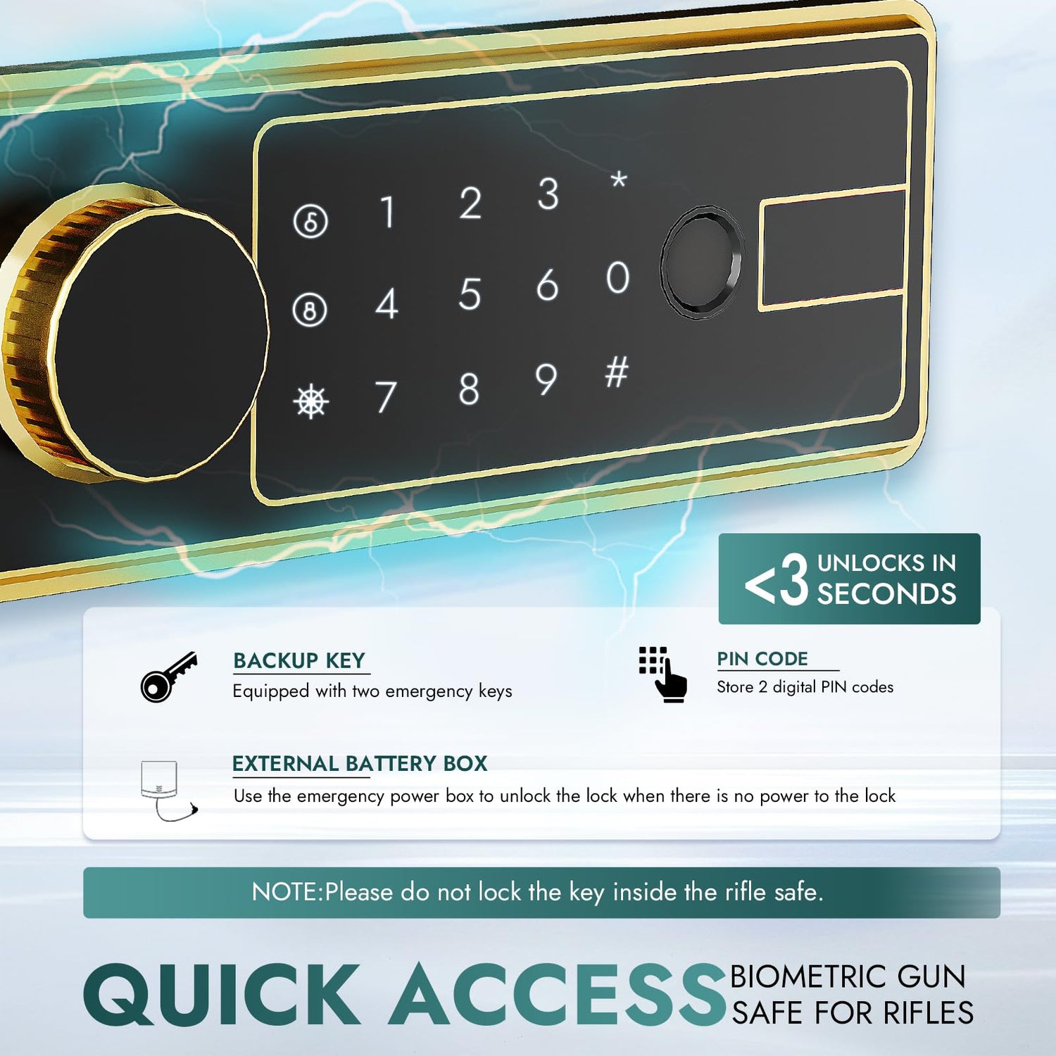 - 【Quick Biometric & Keypad Access】Unlock your gun storage in <1 second with the fingerprint scanner. This rifle safe also provides secure access via PIN code or backup keys, ensuring quick entry while keeping others out.