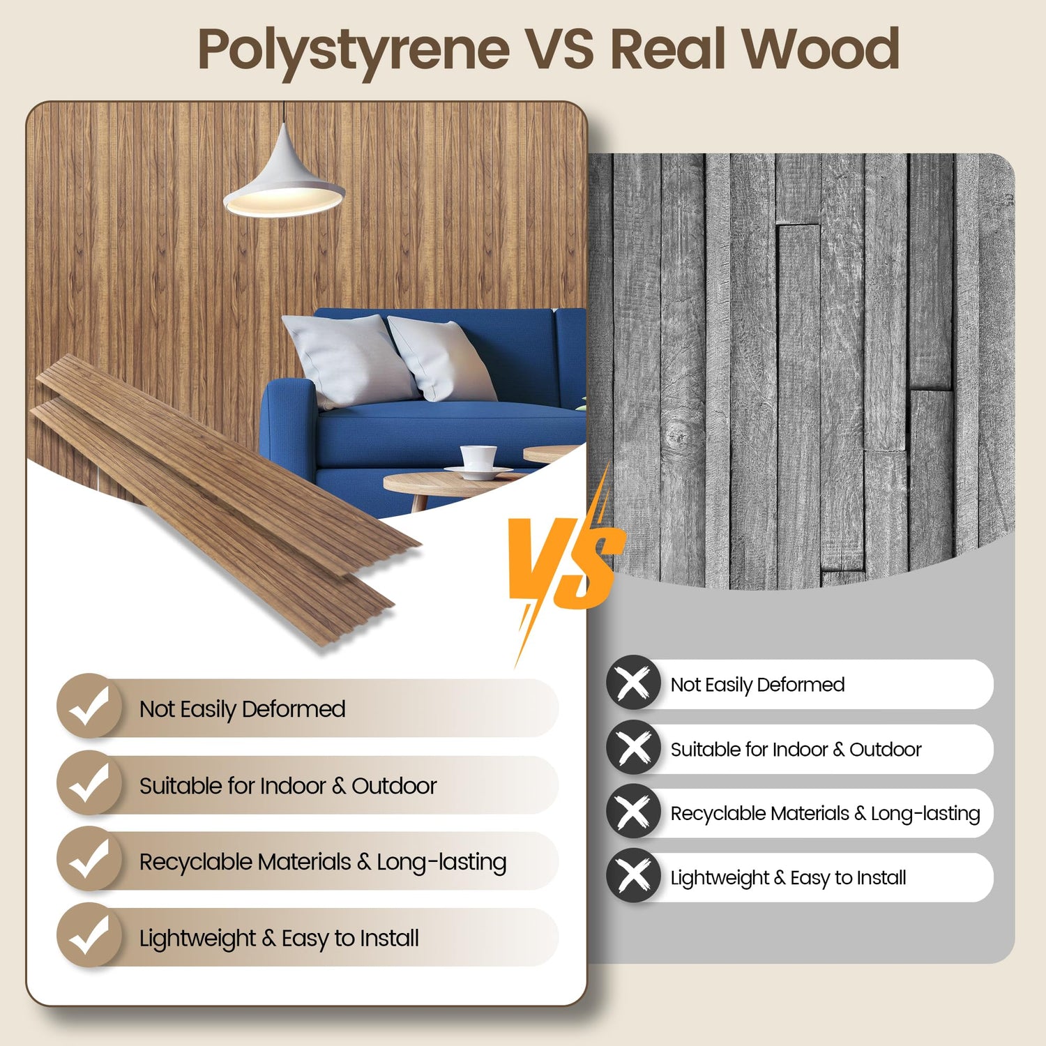 - Premium Material: Crafted from durable PS (polystyrene), our Kasaro wood wall panels are rugged, waterproof, lightweight, and scratch-resistant. The unique slat design offers a traditional natural appearance, whether used as wall panels or ceilings. Enhancing visual appeal and making it an ideal choice to enhance your lifestyle.