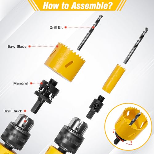 - 【11 Hole Saws and 7 Accessories】: Including 11pcs size saw blades: 3/4"(19mm), 7/8"(22mm), 1"(25mm), 1-1/8"(29mm), 1-3/8"(35mm), 1-1/2"(38mm), 1-3/4"(44mm), 2"(51mm), 2-1/8"(54mm), 2-1/4"(57mm), 2-1/2"(64mm), 2pcs mandrels, 4pcs drill bits, 1pc hex key.