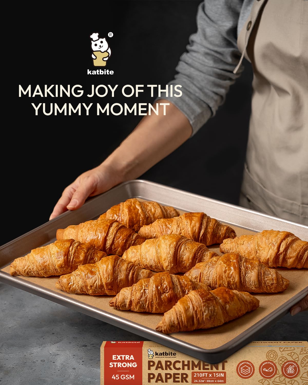 Katbite Unbleached Parchment Paper for Baking, 15 in x 210 ft, 260 Sq.Ft, Heavy Duty Baking Paper with Slide Cutter, Non-stick Brown Parchment Paper Roll for Cooking, Air Fryer, Steaming, Baking Bread