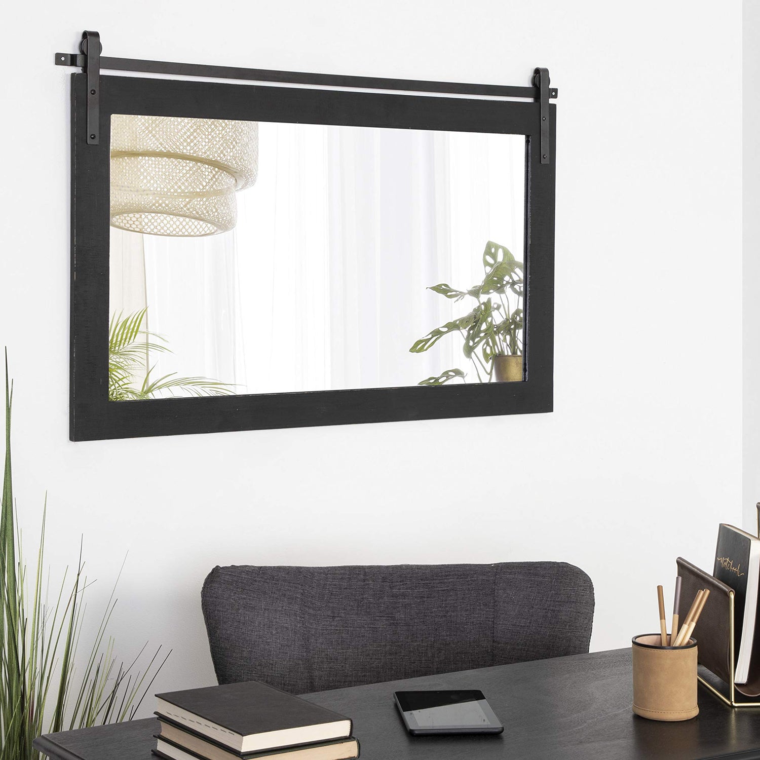Details: Are you a fan of the timelessness of farmhouse design? Then the Cates horizontal wall mirror is an excellent addition to your home! Inspired by rustic, antique decor, the Cates horizontal mirror features a barn door design with a wood frame and metal brackets. The wooden frame also has a black finish that is distressed by hand as an added bonus, giving you a one-of-a-kind accent piece for any room. Adding a mirror to your home provides more light to your space, creating a more open concept and feel. Hang it on its own or in multiples for the ultimate farmhouse vibe. Its overall display size is 40 inches wide by 26.25 inches tall, making it the perfect size to hang over a vanity as a master bathroom mirror. You could also explore the other pieces within the Cates collection to create the ultimate farmhouse wall display for organization and storage! When your new Cates wall mirror arrives, you'll be able to hang it in a matter of seconds with the subtle and convenient holes pre-drilled into the metal brackets.
