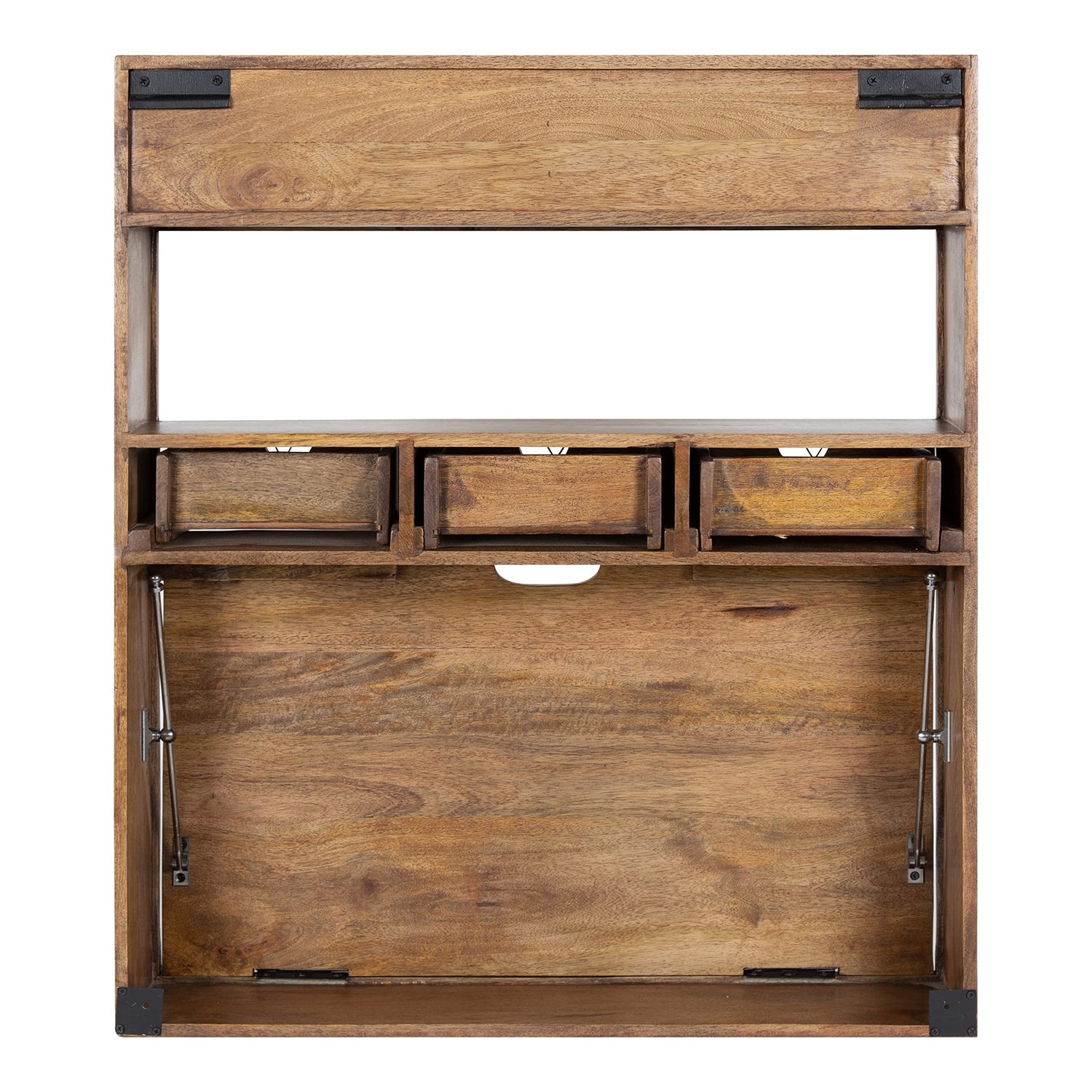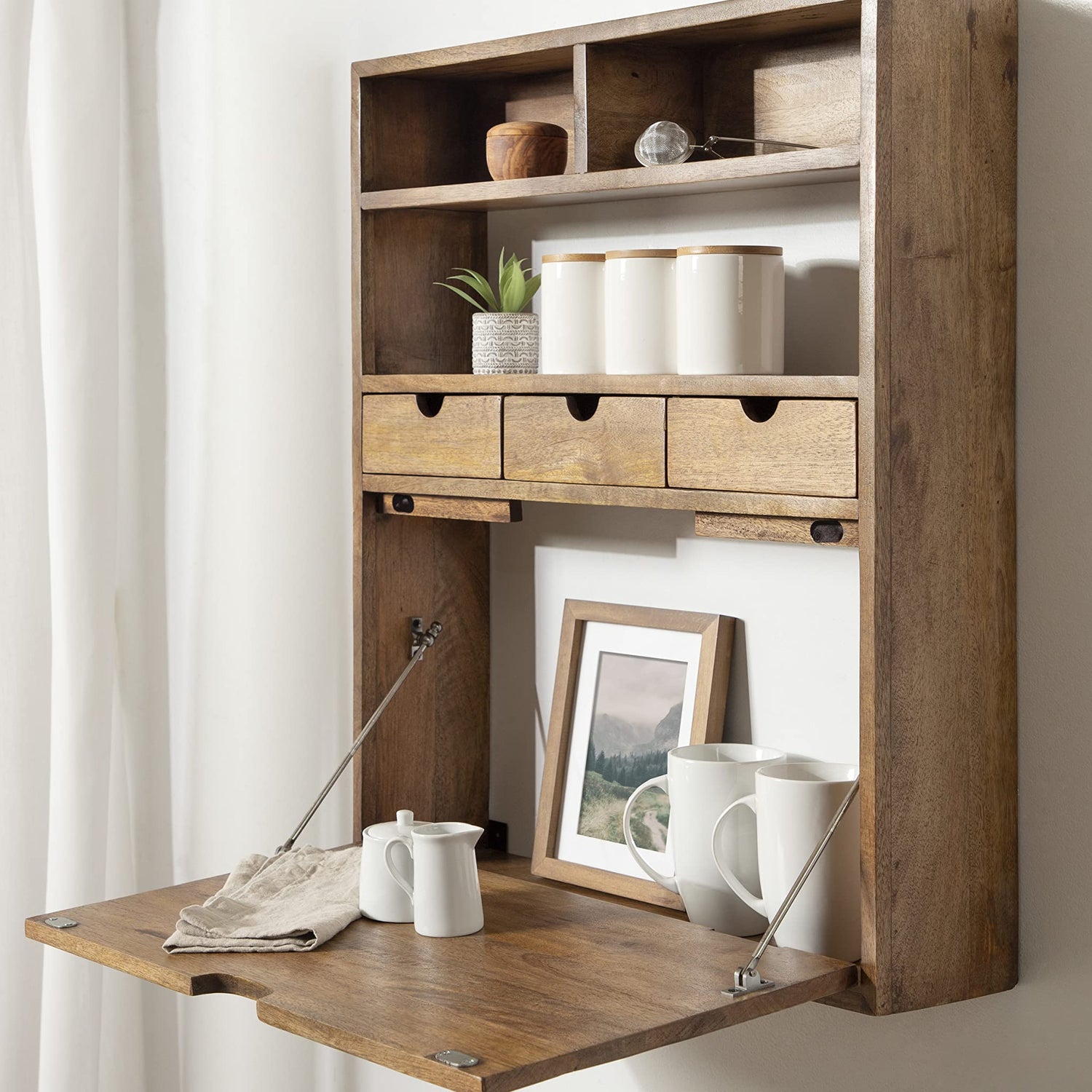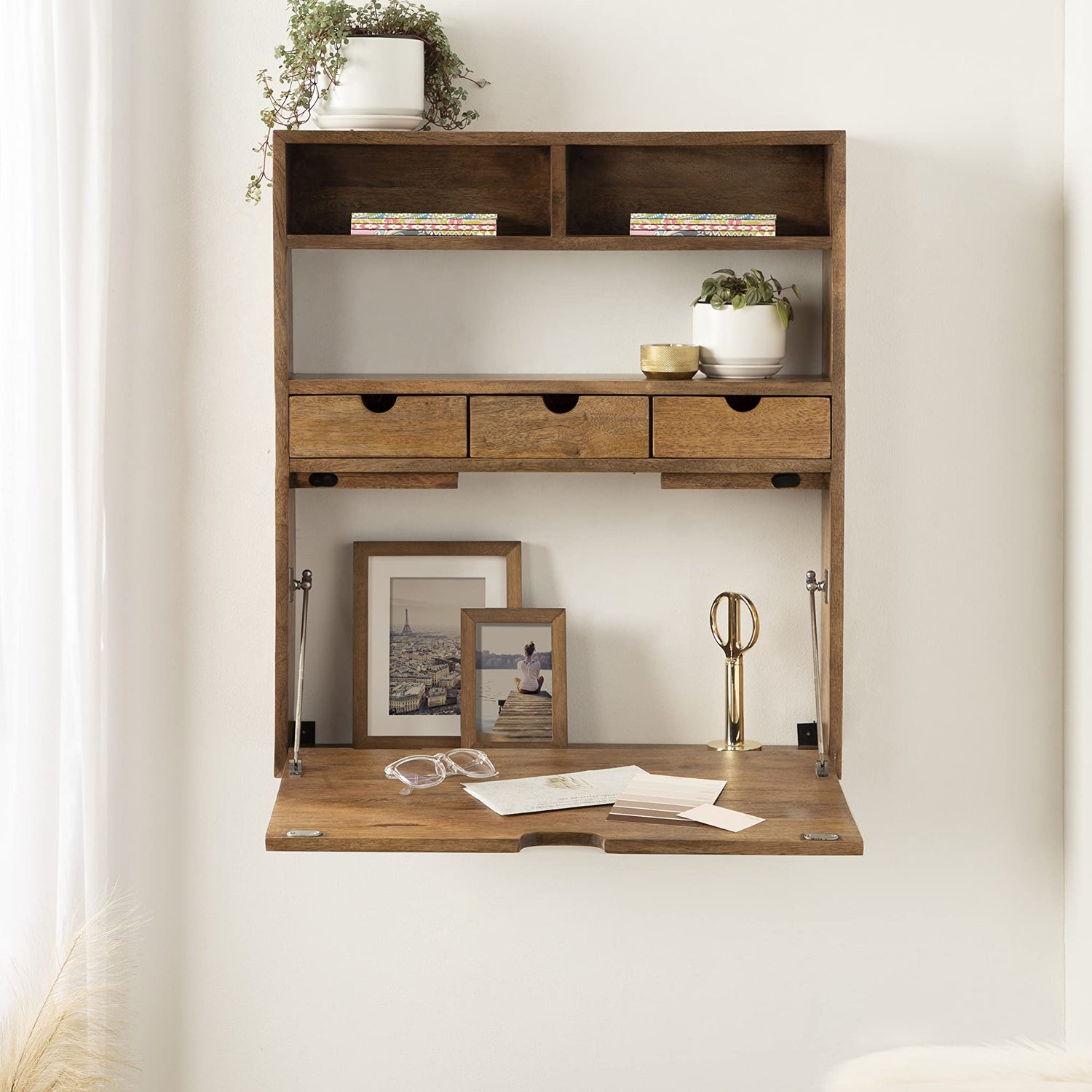 Details: The Georgie desk is an excellent solution for creating a functional home office without taking up too much floor space. This modern, foldable desk features a tabletop that folds up, plus drawers, cubbies, and shelves for display and storage. Each Georgie desk is handcrafted by skilled artisans in India out of robust mango wood and resilient iron, making each piece look distinct in woodgrain and finish. The Georgie is 26 inches wide by 6 inches deep by 30 inches tall for a compact design that doesn't take too much floor space. Each pull-out drawer is 8 inches wide by 6 inches deep by 3 inches tall, providing you individual compartments for folders or office supplies. Use the large 26-inch shelf or one of the two cubbies to decorate with keepsakes or start a library of books, binders, and folders. This desk is perfect for the person who needs a space for productivity that can easily convert back into a living room at the end of the day. Hang the robust Georgie folding desk in a matter of minutes, thanks to the sturdy Z-brackets and practical pre-drilled holes within the frame.