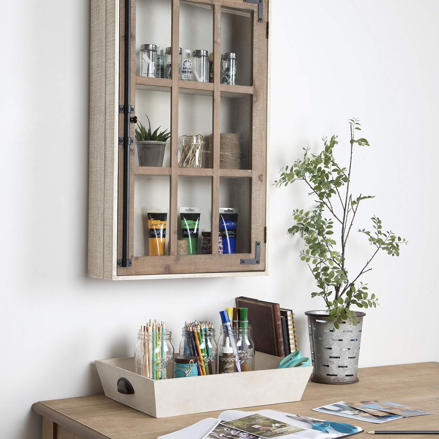 Details: Decorate your home in vintage farmhouse style using this unique hanging wall shelf with a beautiful glass windowpane door. This hanging cabinet will organize spaces if you only have a bit of wall space but still want smart storage and great looks. It'll work exceptionally well in an entryway, mudroom, kitchen, bathroom, living room, or guest room. It has three inner shelves to store items of different shapes and sizes. The single windowpane door opens with a vintage metal locking handle and shuts securely with a magnetic clasp. The outer dimensions of this wall shelving unit are 31.5-inches tall x 19.5-inches wide x 6-inches deep. Two metal Z-bracket hangers are installed on the back of the cabinet for easy, sturdy wall display. This wall cabinet arrives completely assembled and ready to use.