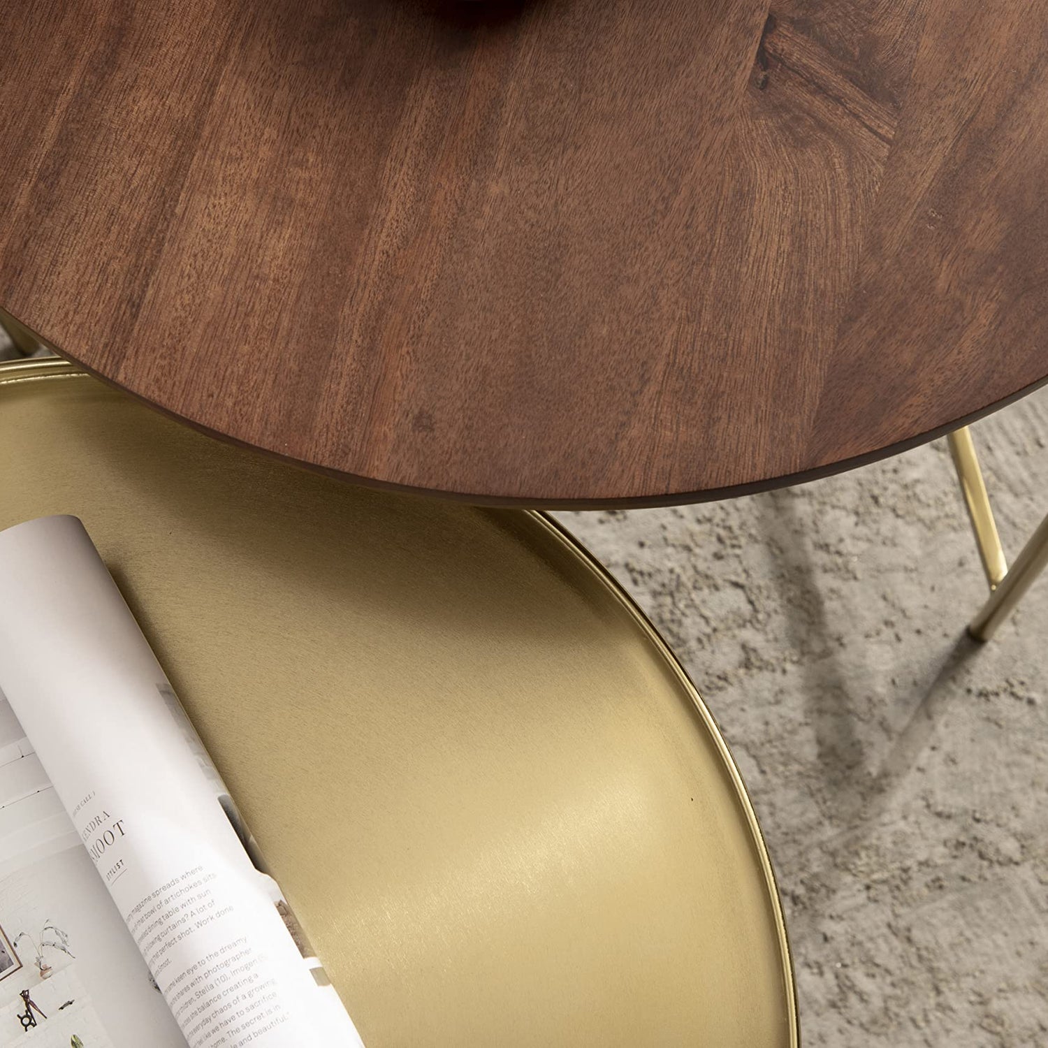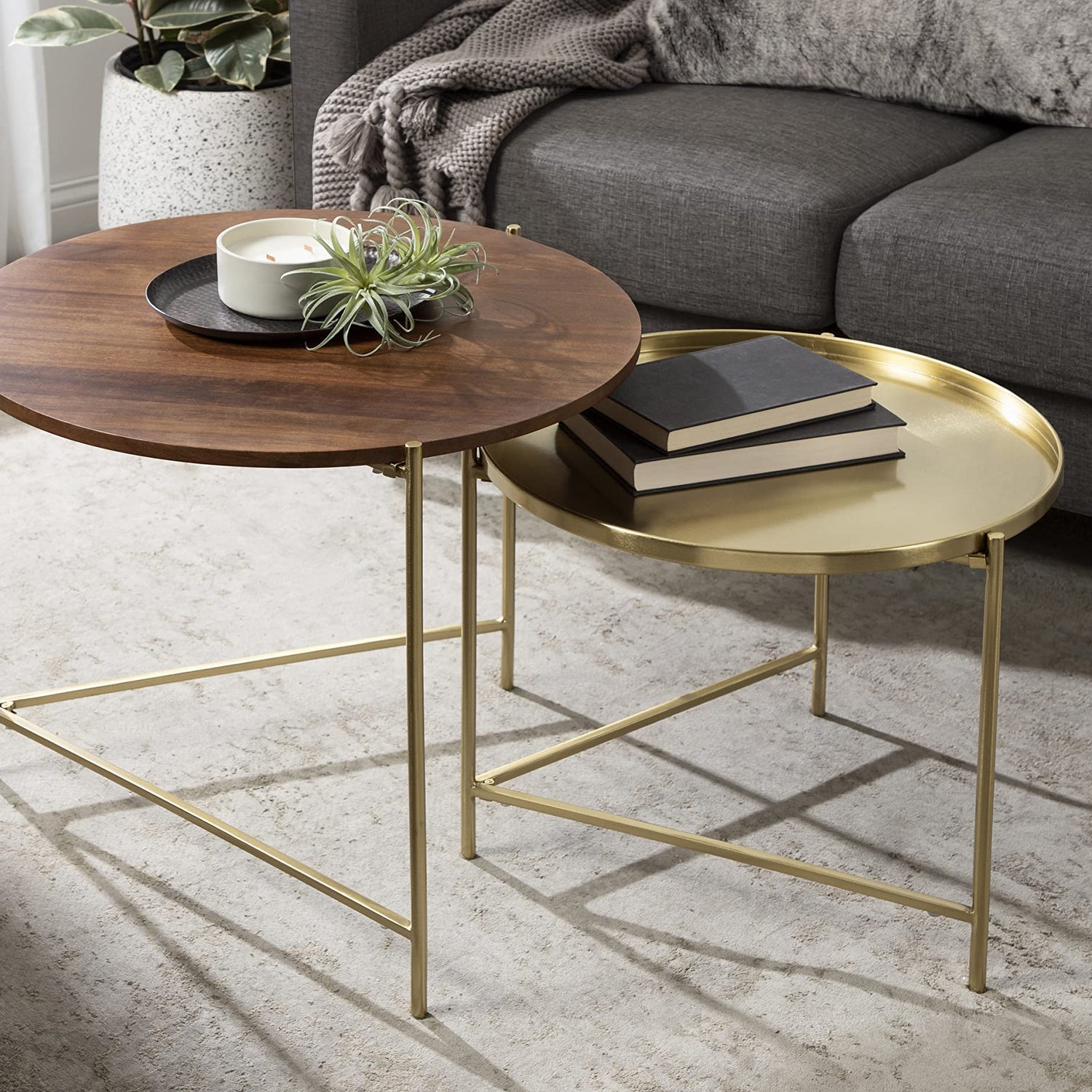 Details: Elevate your living space with a modern aesthetic in the Ulani nesting tables. These tables feature a lovely gold frame incorporating clean lines and geometric detailing inspired by contemporary design. This edition of our Ulani tables apart is a mixture of materials. While each frame is crafted from rich iron material, the larger Ulani has a distinct mango wood tabletop with a walnut finish. In contrast, the shorter counterpart has an iron tabletop with a raised lip and a gold finish. The Ulani collection sets itself apart with its stunning handcraftsmanship, making each piece vary in finish and woodgrain for a one-of-a-kind look. The larger Ulani table has an 18.5-inch diameter and is 24 inches tall, while the smaller Ulani table has a 17-inch diameter and is 20.25 inches tall to nestle within its larger counterpart. Indulge in your decorative instincts by using these large tabletops to showcase a lamp, photos, plants, or must-have household items. Want to shake up your storage? The Ulani is also fantastic as a catch-all for keys, wallets, media remotes, magazines, and more!
