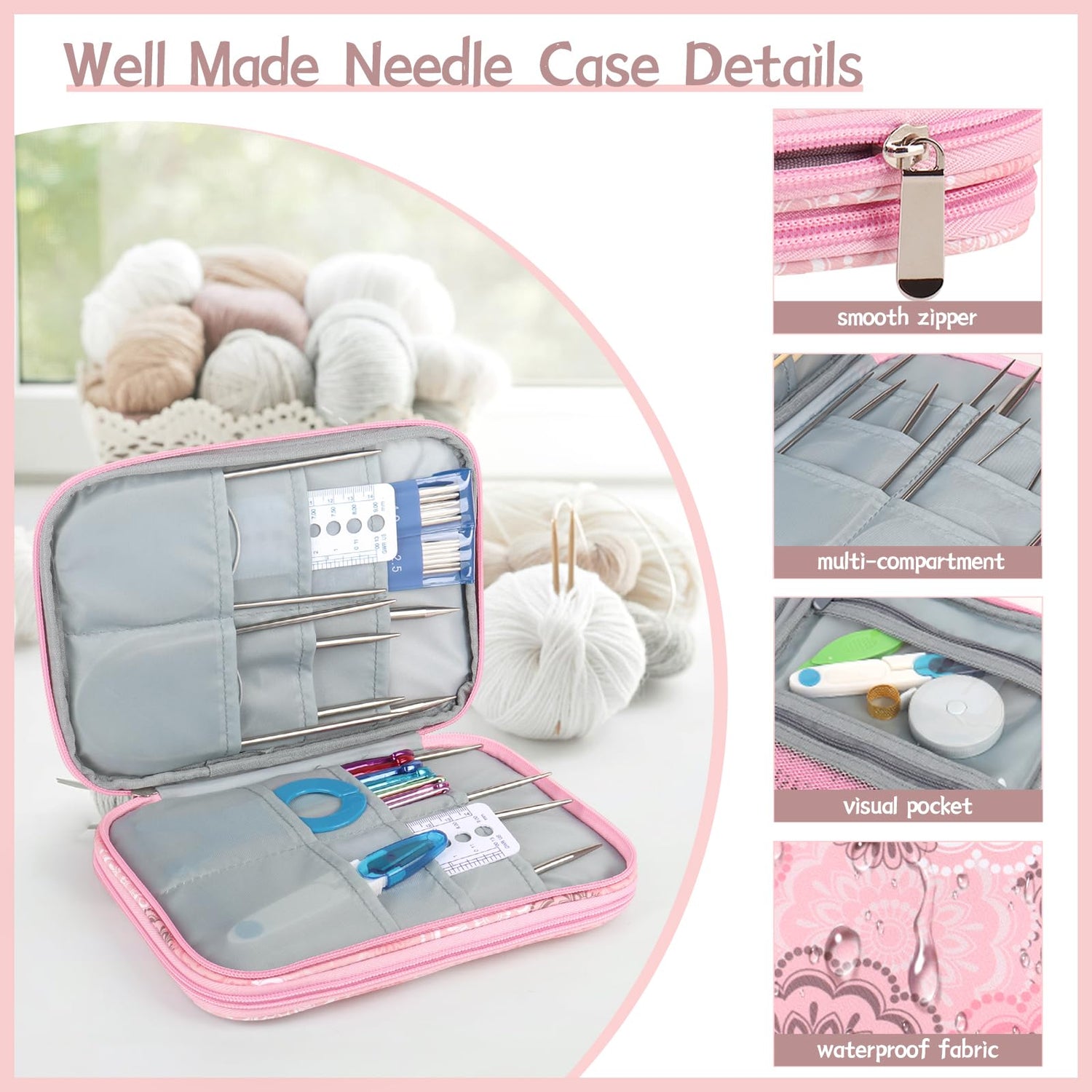 - Exquisite Designs Durable & Waterproof: Knitting needle organizer is made of premium and durable fabric. The material of knitting needle storage is waterproof and easy to clean. With a pretty pink floral pattern, this crochet needle case is one of the most eye-catching of all the knitting storage.