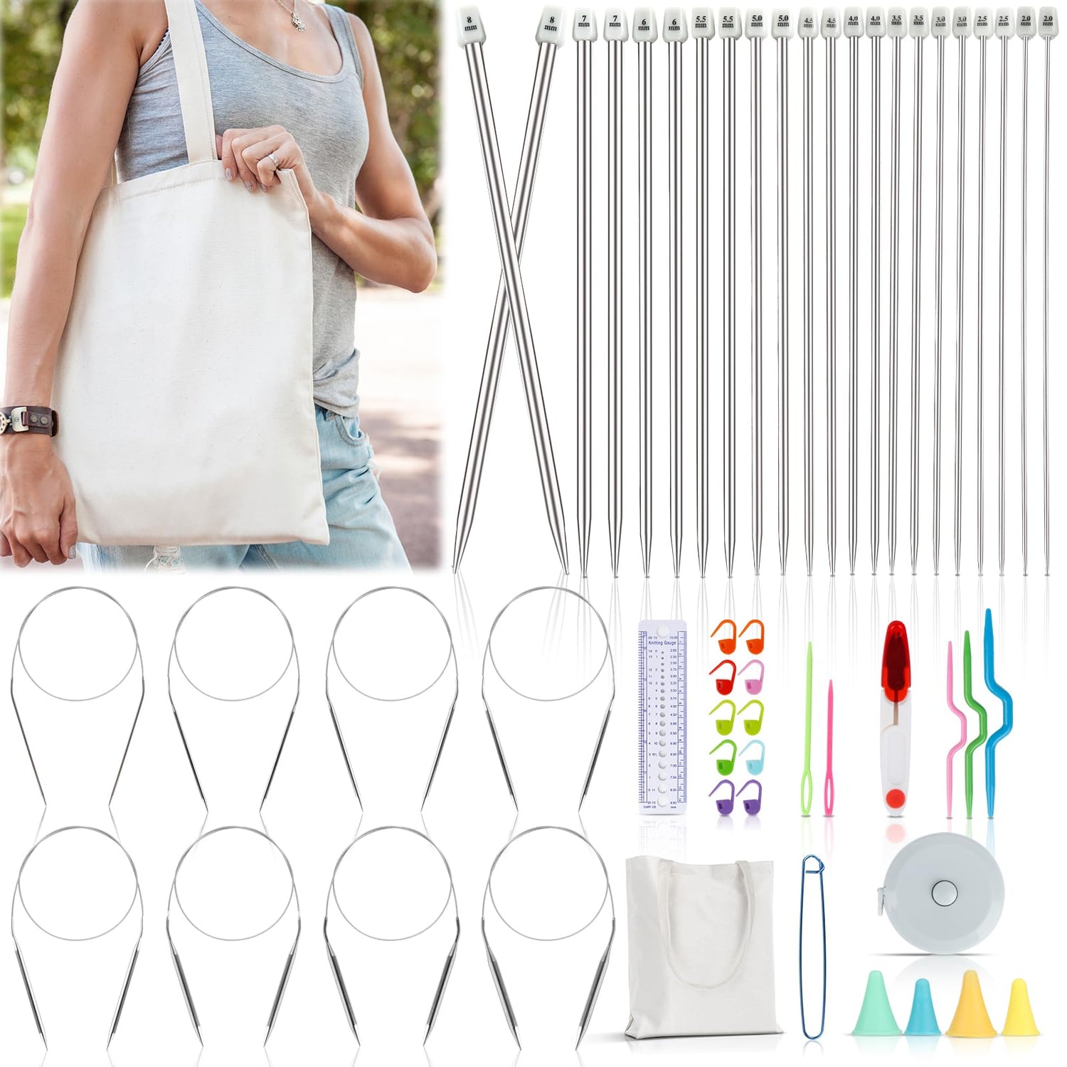 Katech Knitting Needles Set for Beginners, 9 Pairs Circular Knitting Needles Set and 22 Pcs Single Pointed Knitting Needle Set with Tote Bag Knitting Accessories Knit Supplies