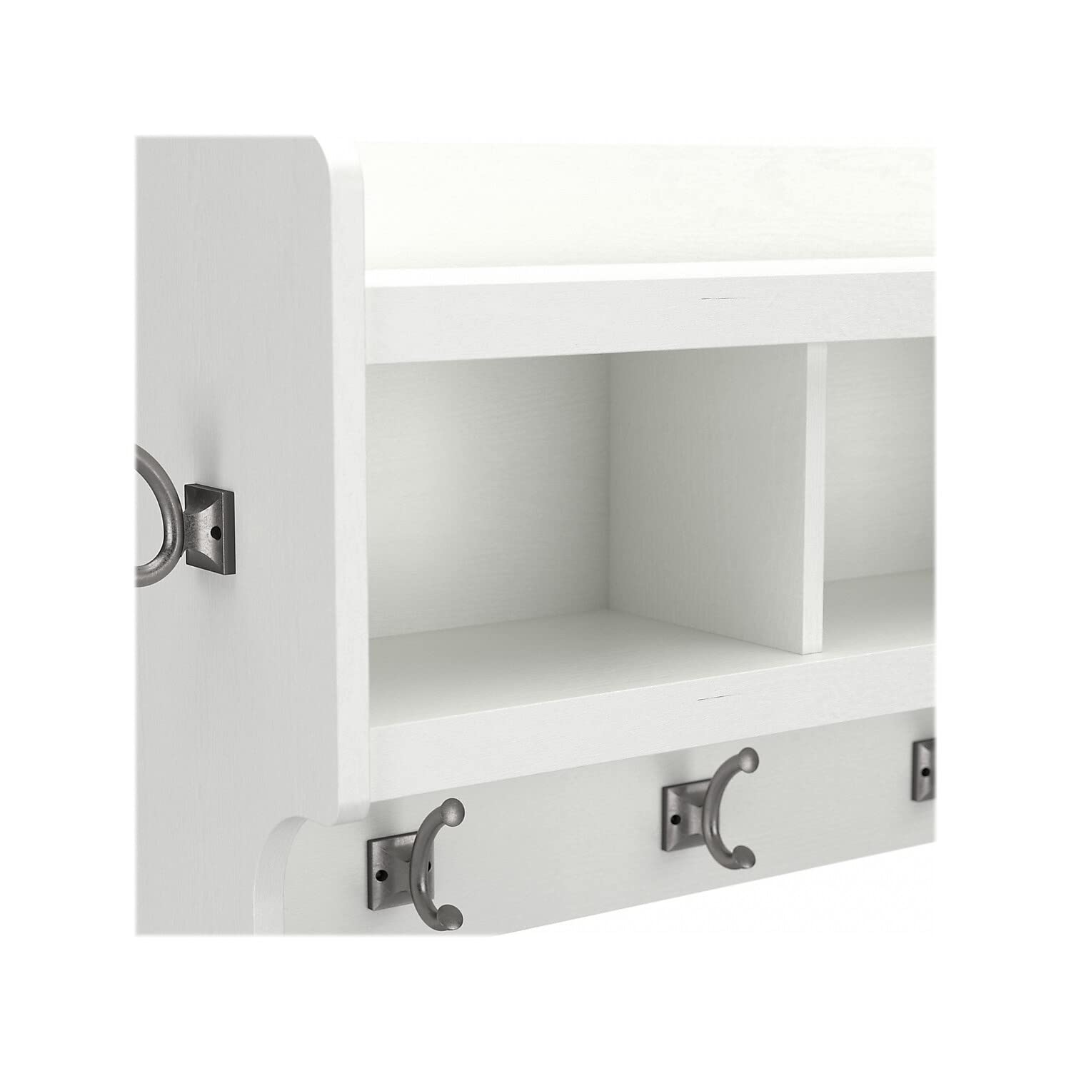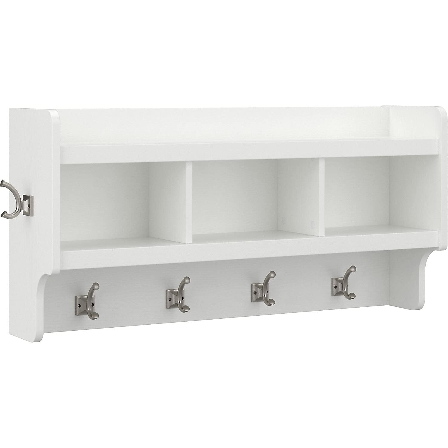 Details: The Bush Furniture Woodland 40W Wall Mounted Coat Rack with Shelf combines transitional styling and a practical design to offer an ideal entryway organizer. Store outerwear and other daily essentials in one convenient location so that everything is right where you need it when it's time to head out the door again. The wall shelf includes four Weathered Nickel coat hooks in the front and one on each side for hanging jackets, hats, scarves and more. Smaller items like gloves and keys can be stashed neatly inside three open cubby spaces while the top shelf provides an area to brighten up your entryway with decorations. Coat hooks support up to 15 pounds, and the total weight capacity of the wall mounted shelf is 25 pounds. The wall coat rack's transitional design blends elements of contemporary and traditional styling to complement a wide range of home furnishings while your choice of several attractive finish options make it easy to find the perfect look for your space. This entryway wall organizer has been rigorously tested to meet Bush Furniture's standards for safety, performance and durability and is backed by a 3 Year Manufacturer's Warranty.