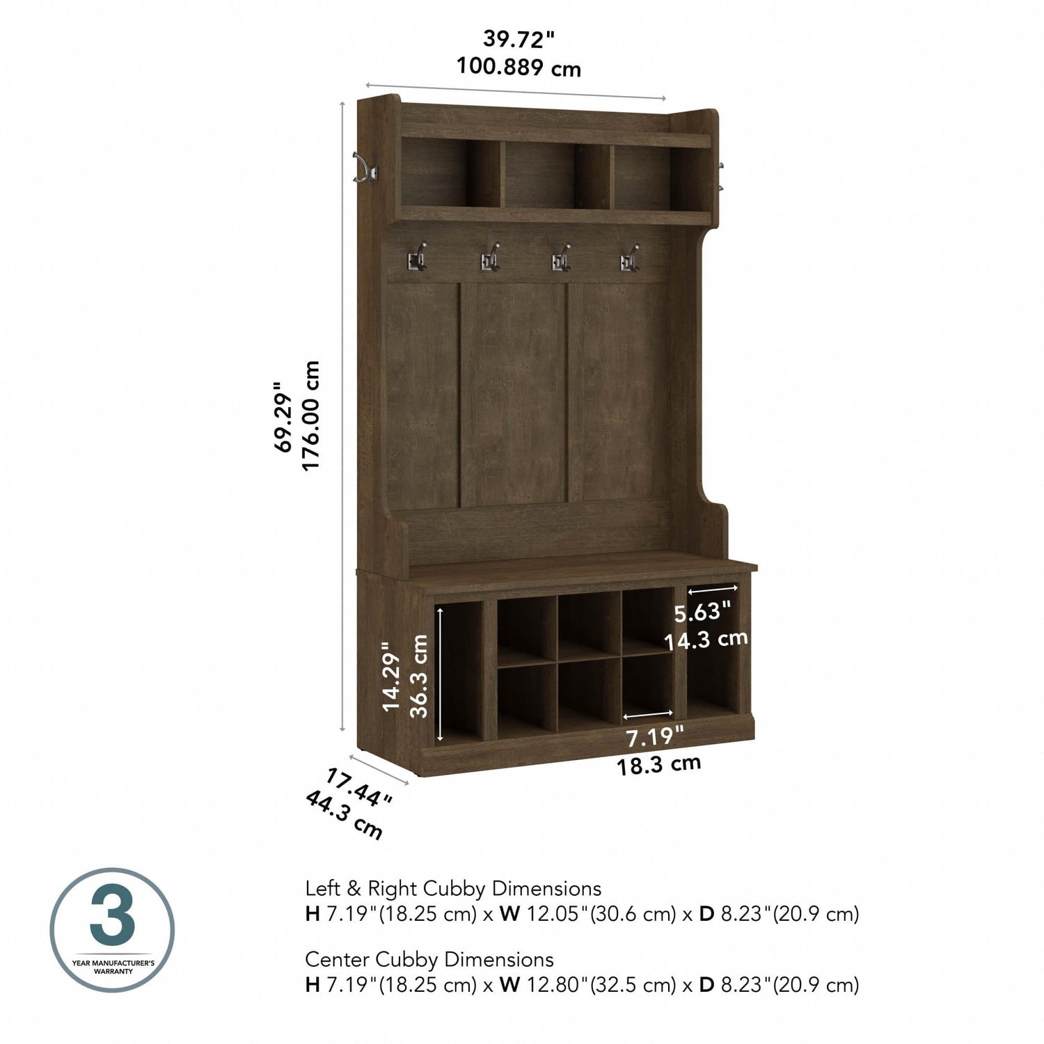 Details: The Bush Furniture Woodland 40W Hall Tree and Shoe Storage Bench with Shelves combines transitional styling and a practical design to offer an ideal entryway organizer. Have a seat on the durable bench surface and take a moment to relax as you get ready to head out the door or come home after a long day. The top of the mudroom bench supports up to 250 pounds, so you can sit down to put on and take off your shoes or set shopping bags down after a trip to the store with confidence. Open storage that includes six cubby spaces and vertical shelves on either side keeps footwear of all shapes and sizes in order. The Hall Tree features four Weathered Nickel coat hooks in the front and one on each side for hanging jackets, hats, scarves and more. Smaller items like gloves and keys can be stashed neatly inside three open compartments, and the top shelf provides an area to brighten up your entryway with decorations. This entryway bench with storage has been rigorously tested to meet Bush Furniture's standards for safety, performance and durability and is backed by a 3 Year Manufacturer's Warranty.