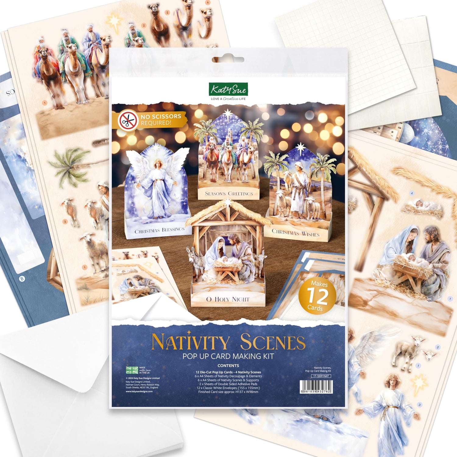 Katy Sue Nativity Scenes Pop Up Christmas Card Making Kit for Adults. Makes 12 Cards & Contains Nativity 3D Die-Cut Decoupage, Supports, Envelopes, Instructions & Foam Pads for Christmas Card Making