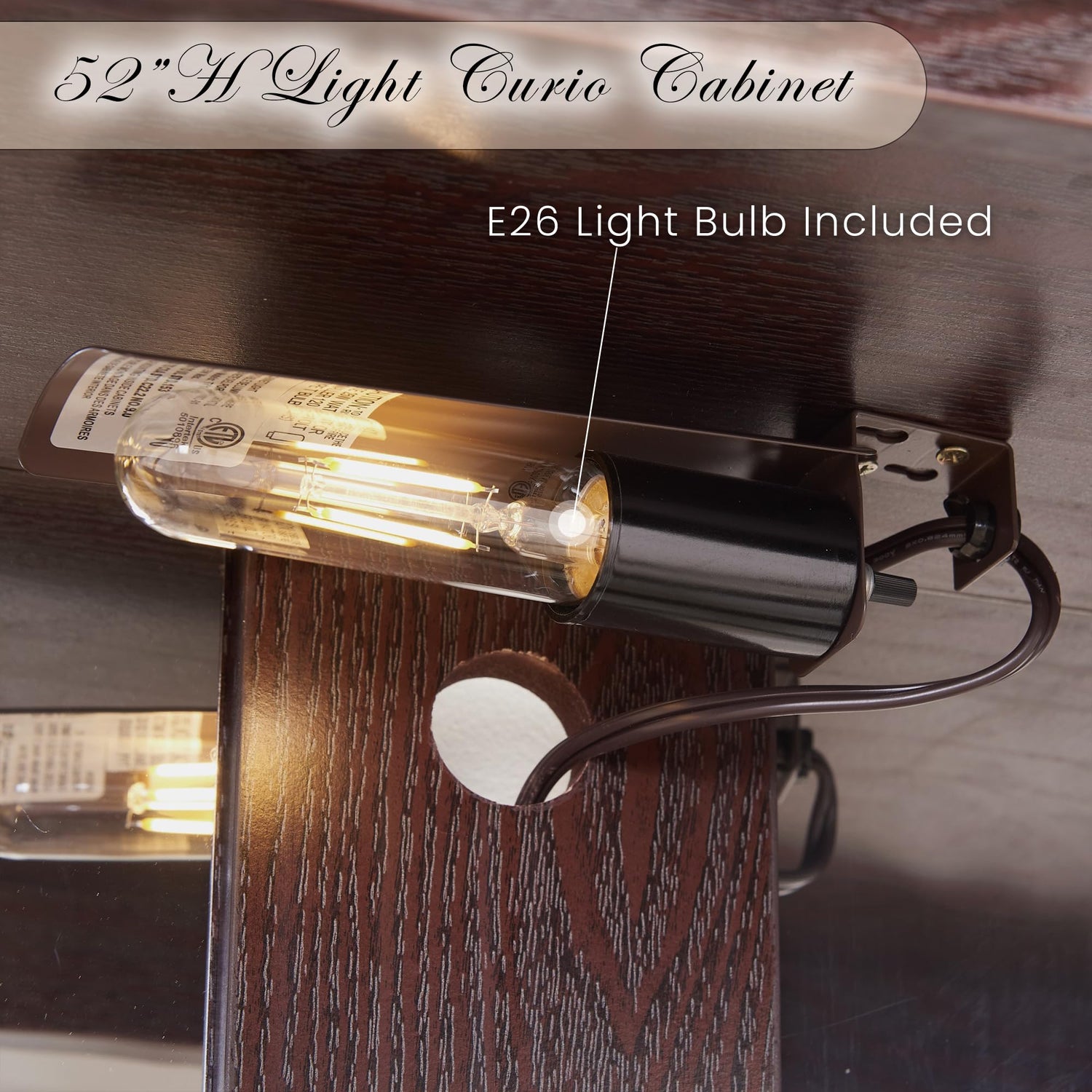 KavlSean 52" H Lighted Display Cabinet, Curio Display Case with 3-Tier Adjustable Shelves, Curio Cabinet with Tempered Glass Doors and Light Bulb, Rack for Living Room Storage (Dark Cherry)