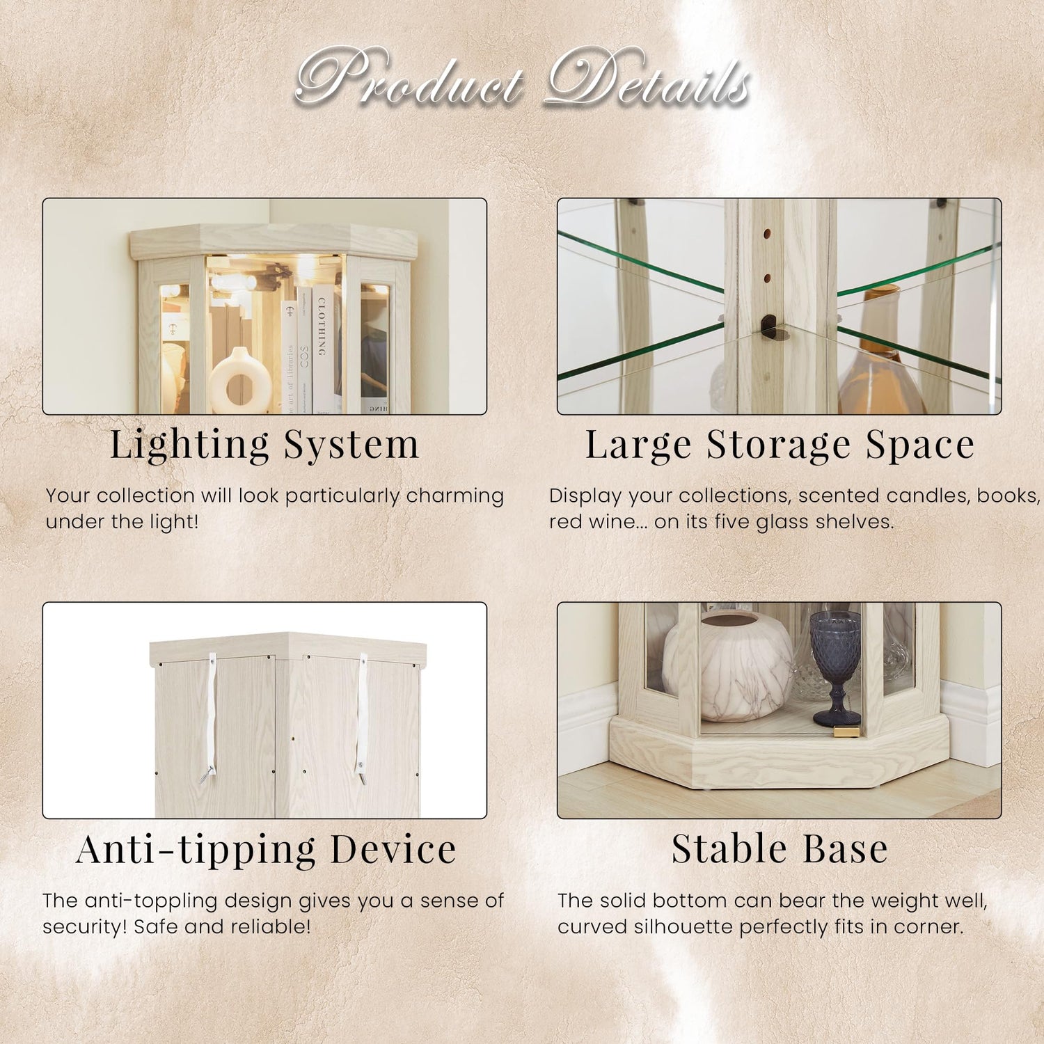 - [Space-Saving Corner Design] - Designed to fit seamlessly into any corner, this slim and stylish curio cabinet makes the most of your space. Whether you’re decorating a cozy apartment or a spacious home, its compact yet functional design keeps your collectibles organized without overwhelming the room.