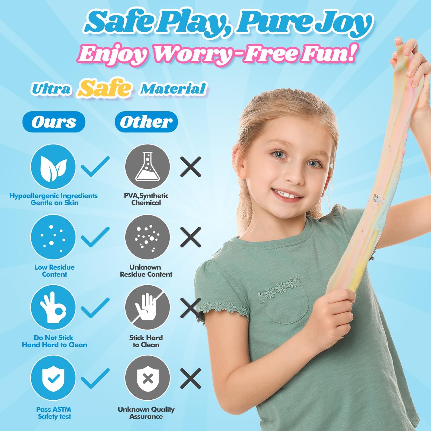 - SAFE & GENTLE: Made with high-grade, hypoallergenic, and non-toxic materials, our slime is gentle on the skin and non-staining. Safe for both kids and adults to enjoy, but always under adult supervision. Not for children under 3 years old, and NOT edible.