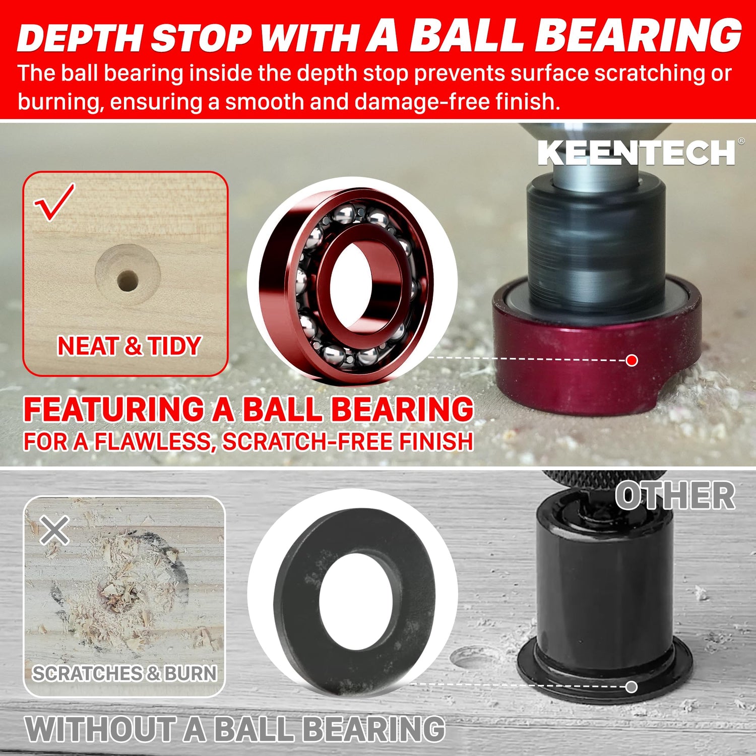 - 【Adjustable Depth-Stop & Ball Bearing】 - The KEENTECH countersink's adjustable depth stop can easily handle both shallow holes for flush screws and deeper holes to hide screws. The design maintains uniform depth for consistent drilling, preventing variations from pressure changes. The countersink drill bit with depth stop features a ball bearing that prevents scratches and burns, ensuring a flawless, scratch-free finish every time, eliminating the need for secondary polishing.