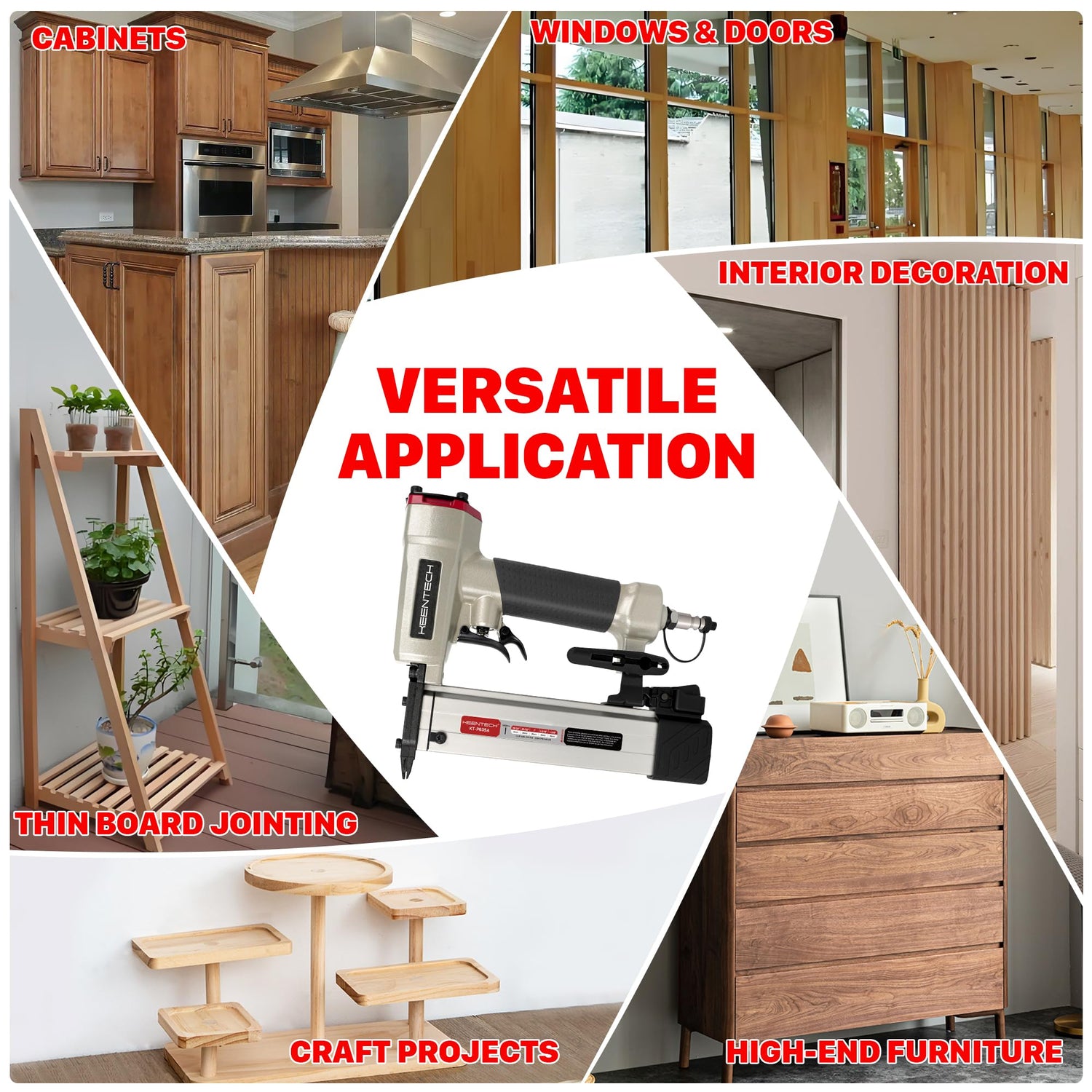 - 【Wide Applications】 - Pin nailer kit are perfect for fine finishing work and trim. They can be used in conjunction with wood glue to hold workpieces in place while the adhesive dries. This versatile trim nail gun is suitable for a wide range of applications, including delicate wood pieces, intricate or tiny trim, thin veneers, furniture, window and door frames, cabinets, interior decoration, craft projects, woodworking, and other finishing tasks.