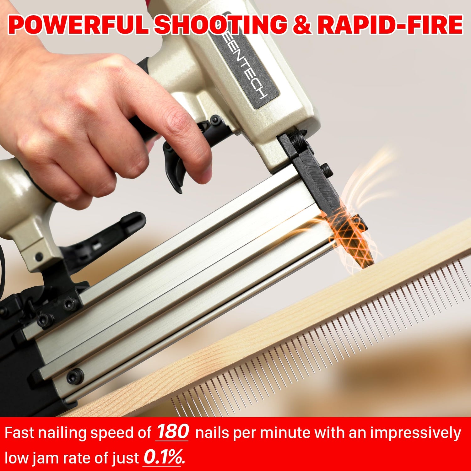 - 【Efficient Nailing & Less Jamming】 - This 23 ga nail gun features a well-engineered cylinder and airway, allowing for an impressive nailing speed of up to 180 nails per minute. Thanks to the superior craftsmanship of the firing pin and muzzle, the entire shooting process is exceptionally smooth, with a jamming rate of just 0.1%. Weighing only 2.3 pounds, it’s easy to handle and equipped with an ergonomic rubber grip to minimize fatigue during extended use.