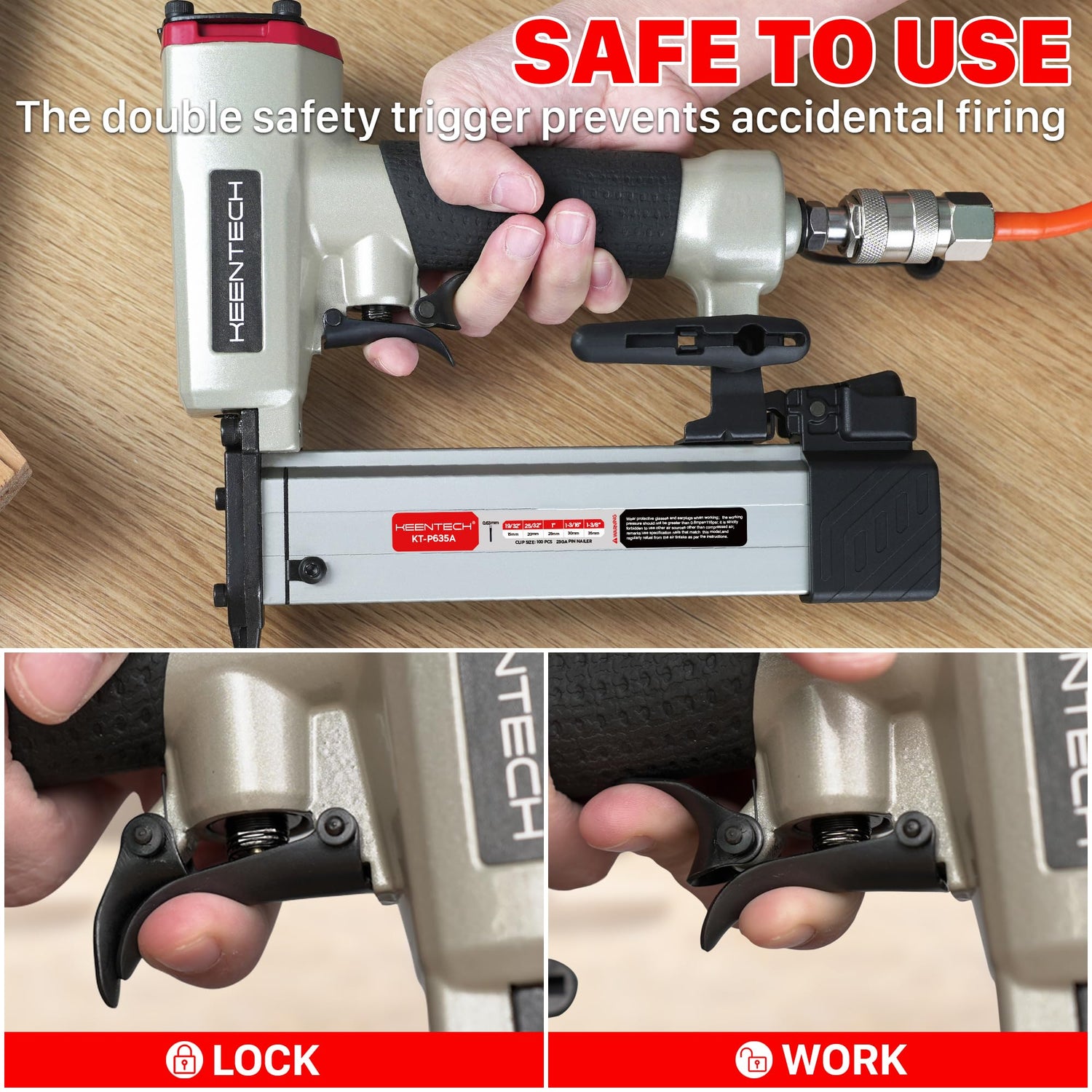 - 【Flawless Finishes & Safety Mechanism】 - This headless pinner creates holes that are so small they are barely visible! Its slim nose design allows for precise nailing, enabling penetration into wood without leaving obvious marks. Ideal for delicate trim work and high-grade decoration where surface integrity is paramount. Additionally, the pin gun features an upgraded double safety trigger to prevent accidental firing, ensuring enhanced safety during use.