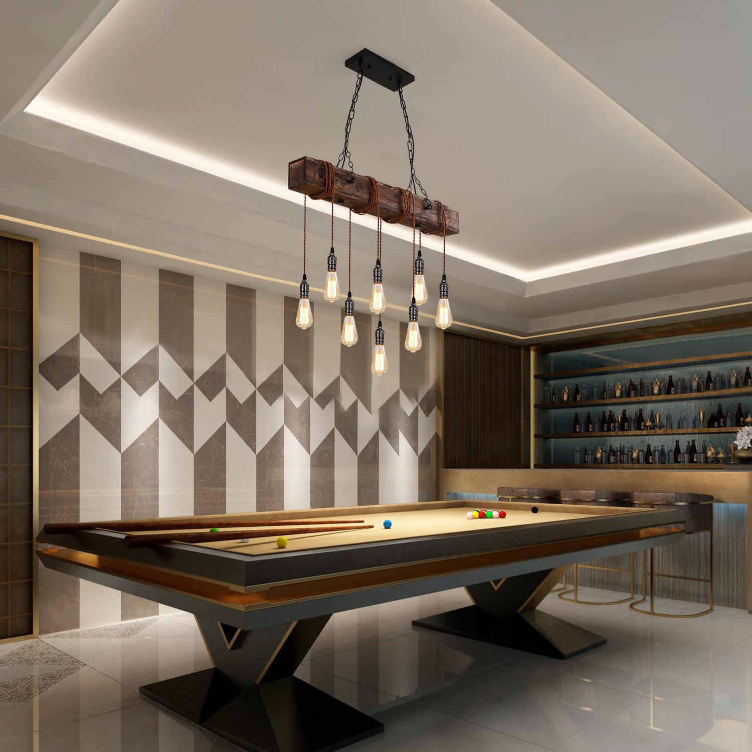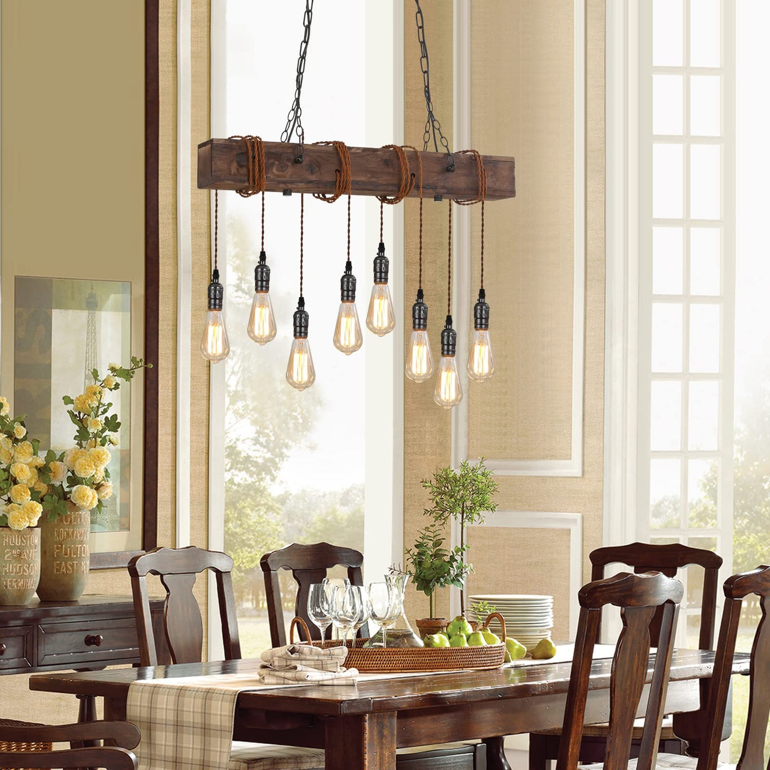 KEESFU 8-Lights Rustic Chandeliers for Dining Room, Farmhouse Wooden Ceiling Pendant Light, Height Adjustable, Rectangle Chandelier for Kitchen Island Dining Room Bar Pool Table Cabin.