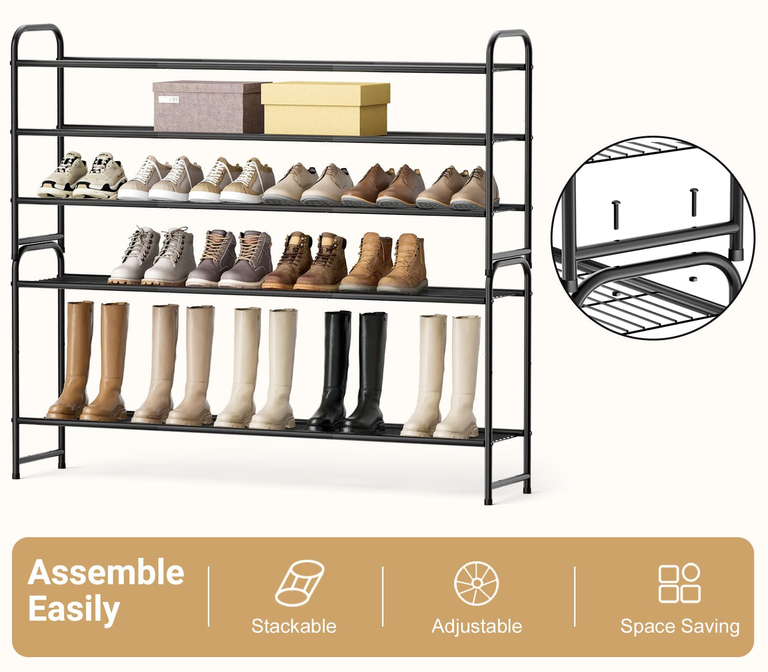 - 【Stackable & Adjustable】 2 sets can be stacked into a 6-tier stackable shoe rack. You can take out a layer to store high boots. Make full use of the vertical space and make your closet and floor no longer littered with shoes. The shoe storage organizer can be installed in short time, user-friendly and space saver;