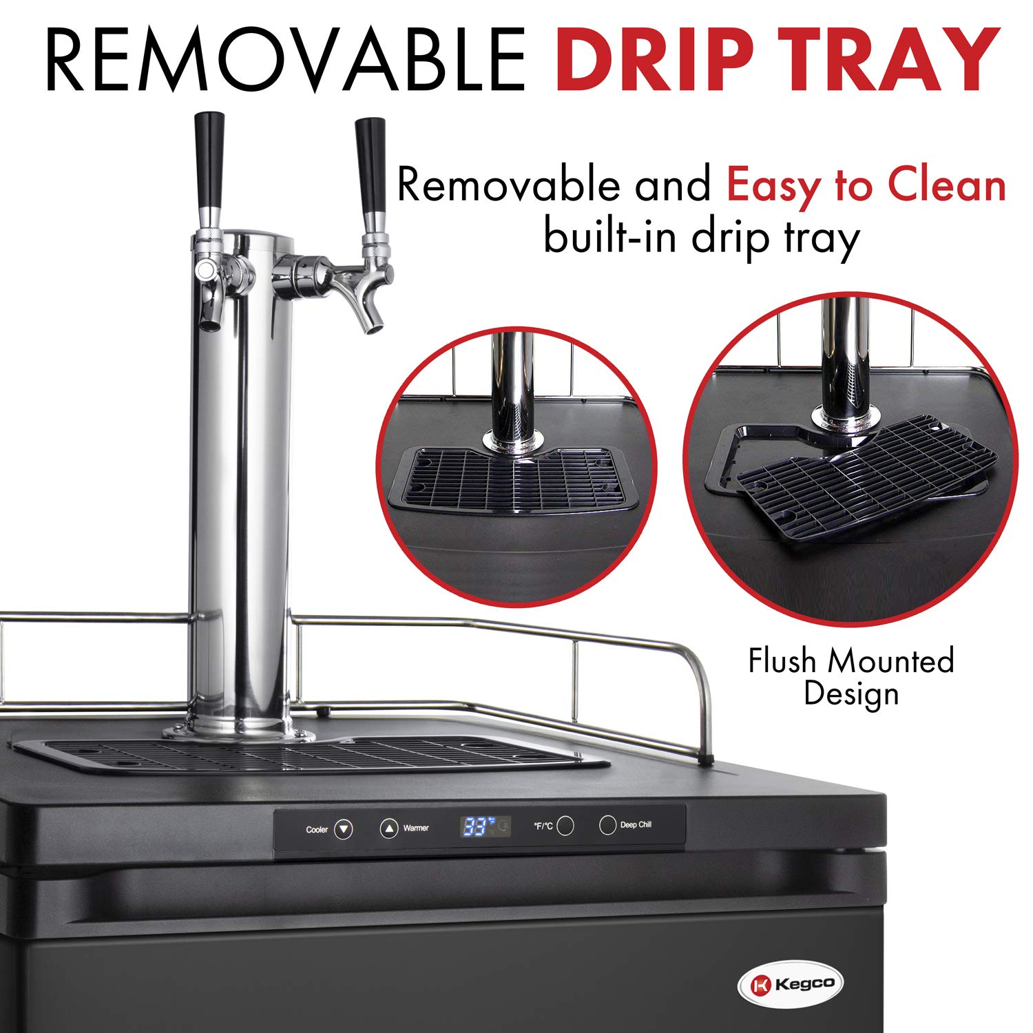 - CONVENIENT DESIGN FEATURES: This Kegco kegerator's convenient design boasts great features like attractive styling, a removable and easy-to-clean built-in drip tray, a chrome guard rail that helps prevent your mugs and glasses from sliding off of the countertop, and easy rolling casters that allow you to easily move the unit from one location to another. The casters lock once the unit is in position, so it won't roll away again until you want it to.
