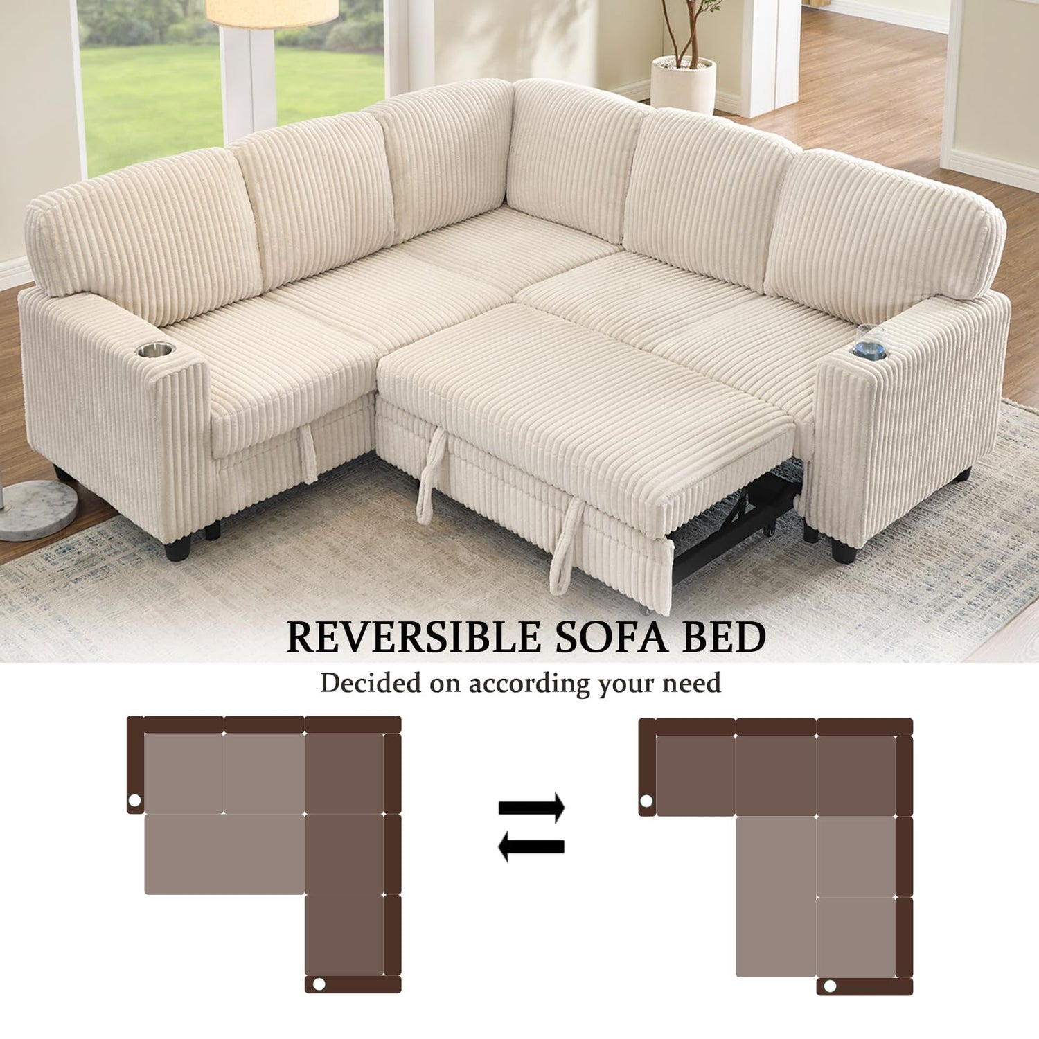 Versatile 2-in-1 Design: This L-shaped sectional easily converts into a sleeper bed, perfect for movie nights, naps, or hosting overnight guests. The adjustable pull-out bed can be positioned on either the left or right side to suit your room layout. Smart Storage & Charging: Stay organized with built-in storage compartments for blankets, pillows, and essentials. USB & Type-C charging ports allow you to keep devices powered while relaxing. Plus, convenient cup holders on the armrests add extra functionality. Luxurious Comfort: The soft, plush corduroy fabric wraps the sofa in comfort, with thick backrests and cushions providing support for ultimate relaxation. Perfect for lounging after a long day or entertaining guests. Durable & Sturdy Build: Built with a reinforced wooden frame, coil spring support, and high-resilience foam cushions, this sectional offers long-lasting durability. Each seat supports up to 400 lbs, while sturdy plastic feet protect your floors from scratches. Easy Assembly: This sectional arrives in 3 separate cartons (may ship at different times) with step-by-step instructions for quick and hassle-free assembly. Be sure to measure your space before ordering to ensure a perfect fit!