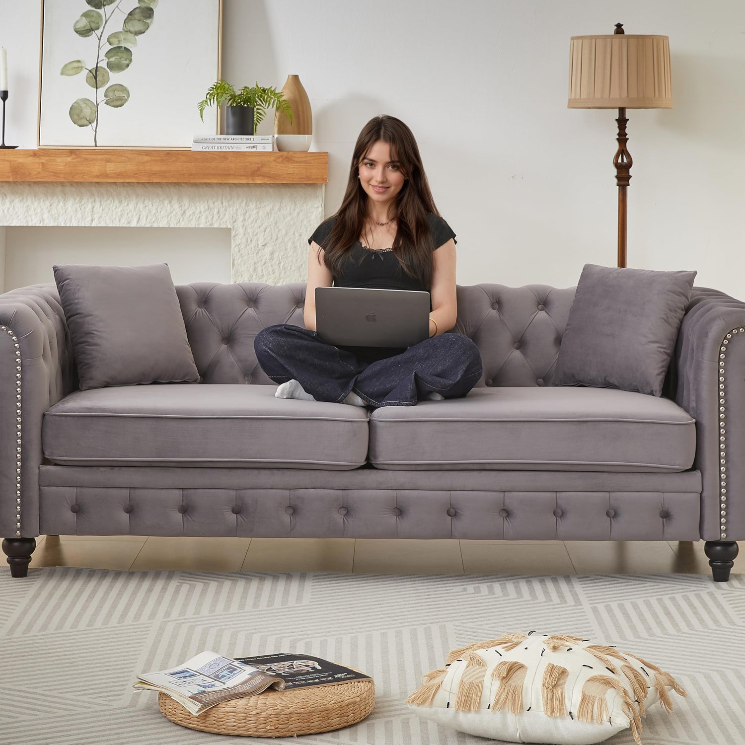 - Premium Velvet Fabric: The sofa is elegantly upholstered in high-quality velvet, offering a luxurious and opulent appearance with an irresistibly soft, plush texture. Its refined sheen and sumptuous feel bring a sophisticated, high-end ambiance to your living space, making it the perfect centerpiece for your living room, guest room, or parlor.