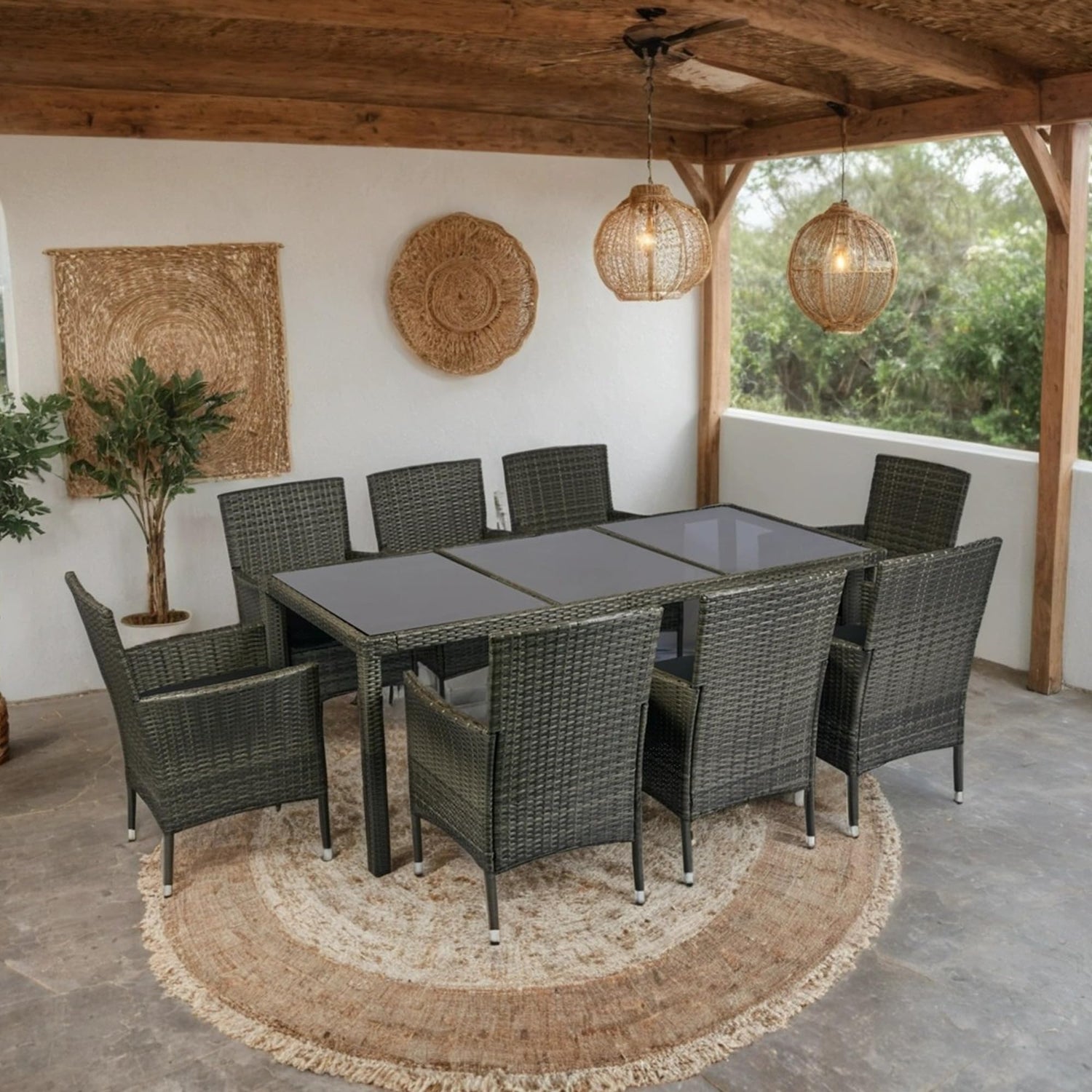 KEIKI 9 Piece Patio Dining Table Outdoor Furniture Set, 8 Wicker Chairs with Cushions & 74.8" Glass Top Dining Table, All Weather Dining Set for Lawn, Garden, Backyard, Poolside, Black & Grey