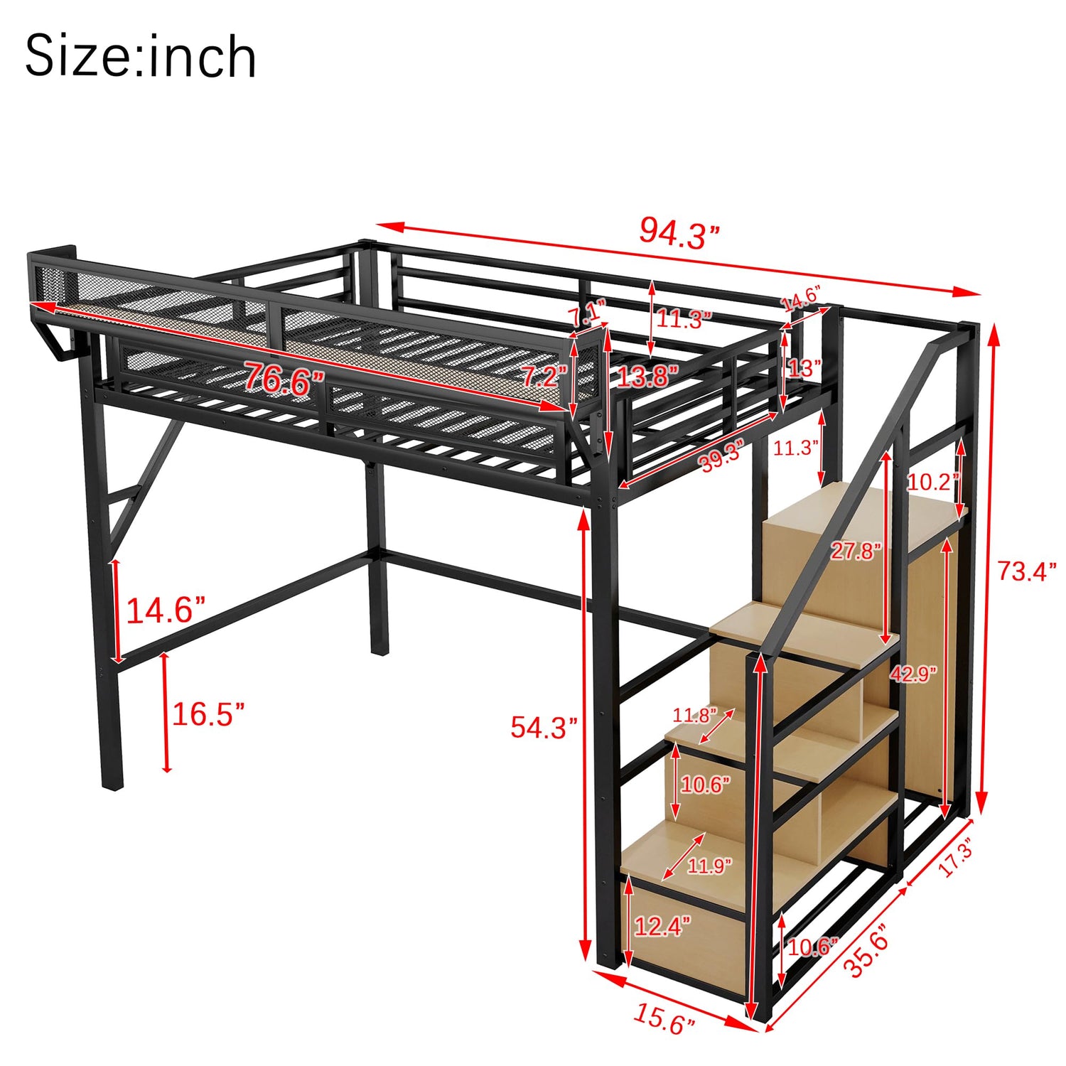 - [Convenient Staircase with Storage Compartments] The loft bed comes with a staircase equipped with built-in storage compartments, ideal for stashing shoes, toys, blankets, and more. The staircase design ensures safe and easy access to the upper bed, making it a practical choice for kids, teens, or anyone who appreciates both safety and convenience.