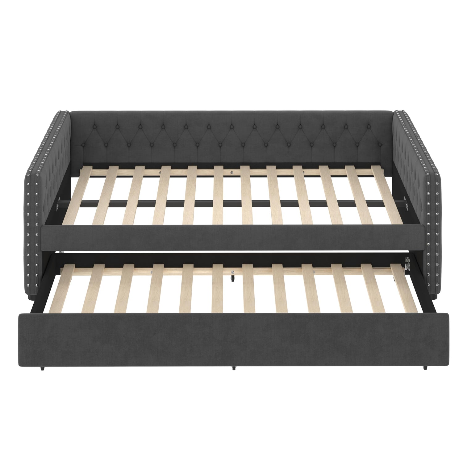 - Sturdy Bed Frame: This upholstered daybed frame is crafted from solid plywood covered with technical fabric for sturdy quality. The evenly distributed bed slats can hold up to 350 pounds. And the trundle bed comes with smooth casters for easy pull-out.