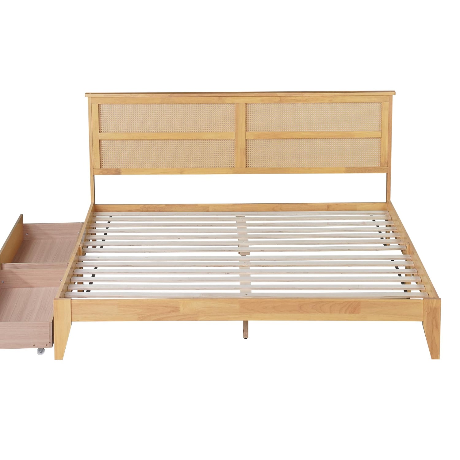KEIKI King Size Wood Platform Bed Frame with Rattan Headboard, 2 Storage Drawers, Modern Style Bed with Solid Wooden Slats, Easy Assembly, No Box Spring Required, for Bedroom, Guest Room, White Oak