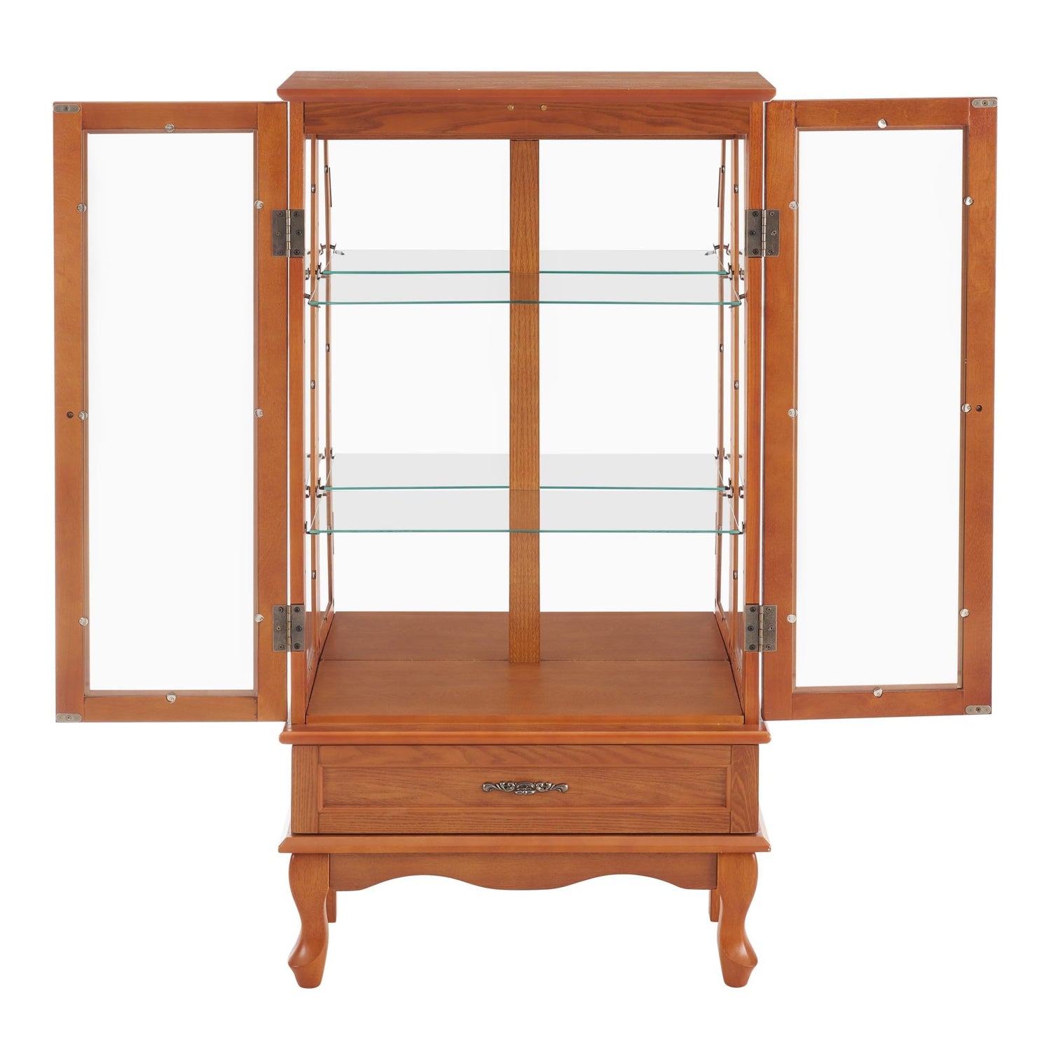 - Versatile Storage Design: Our multifunctional glass display cabinet offers a wealth of storage options. With two glass doors, one drawer, and three shelves (a fixed wooden one and two adjustable tempered glass ones), it's perfect for displaying everything from fine art to everyday items, adapting to your diverse storage needs.
