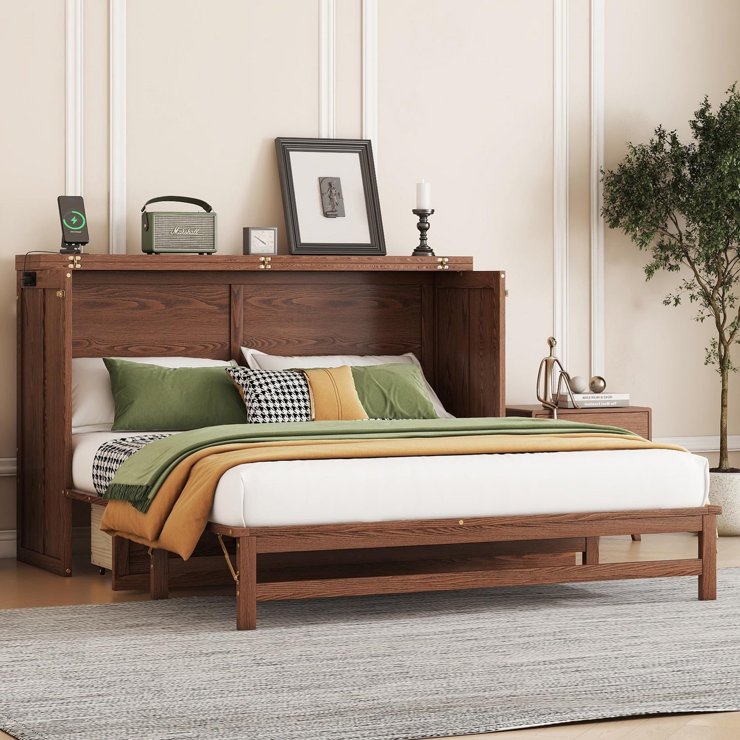 KEIKI Queen Murphy Bed Cabinet with Storage Drawer and Charging Station, USB Port, Solid Pine Murphy Bedframe for Home Office, Studio or Guest Room,Walnut