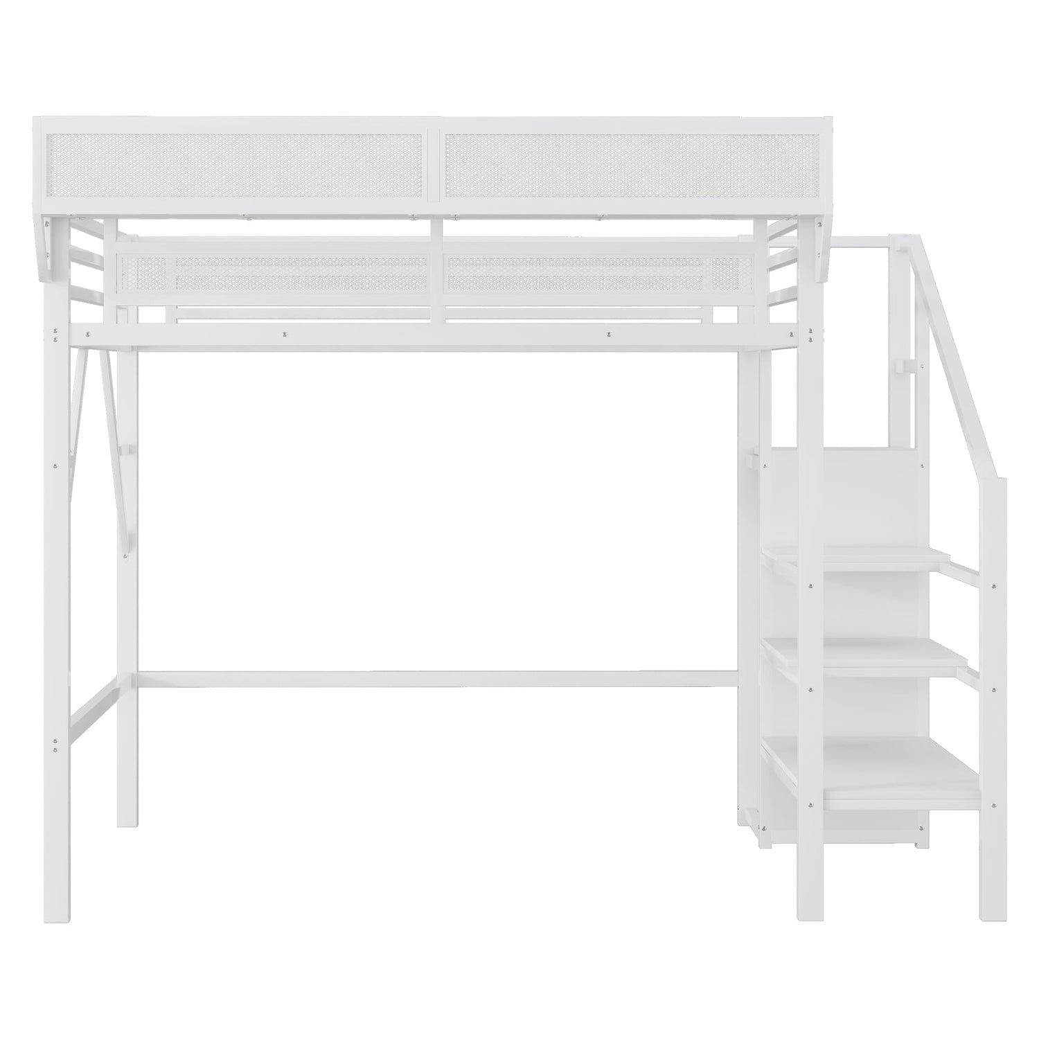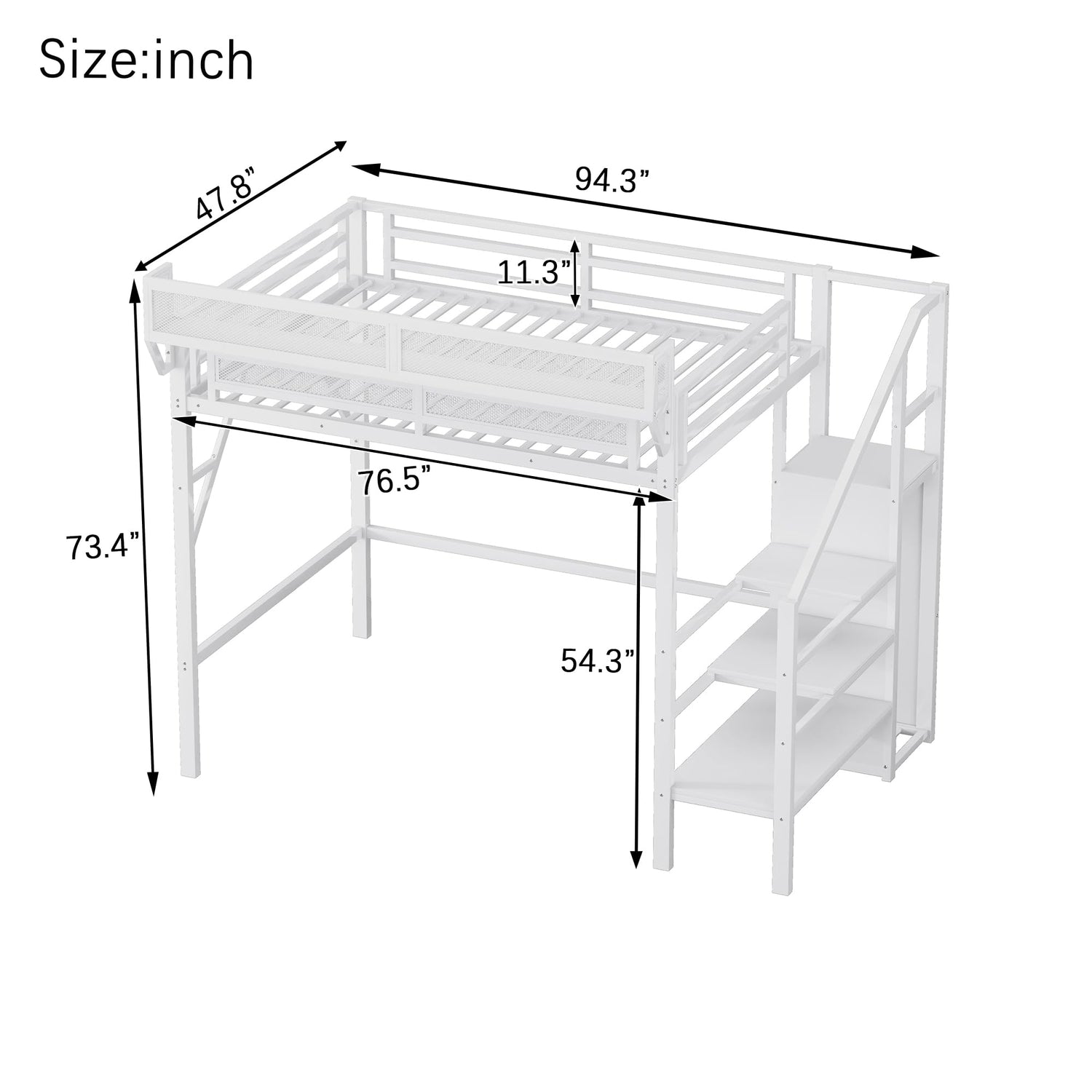 - [Loft Bed with Upper Storage Shelves] This twin size metal loft bed features convenient storage shelves next to the upper bed, perfect for keeping books, gadgets, or small items within easy reach. The integrated mesh prevents items from falling, combining safety and functionality without compromising style.