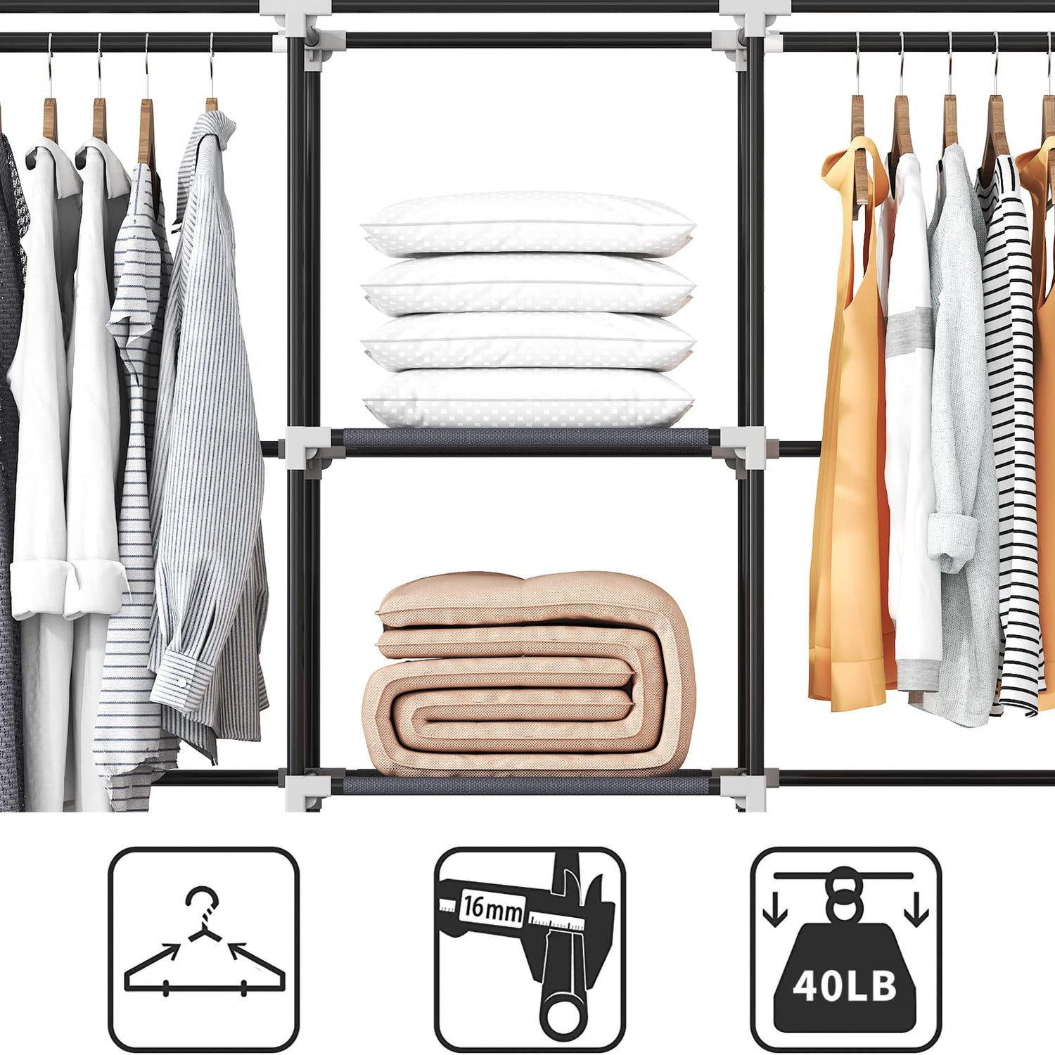 - LARGE CLOSET COMPARTMENTS: Portable closet wardrobe consists of 2 movable hanging clothes rods for jackets or dresses, and coats and 8 storage shelves for bags, hats, accessories, underwear and socks. It will increase space usage to provide a spacious home for everyone.