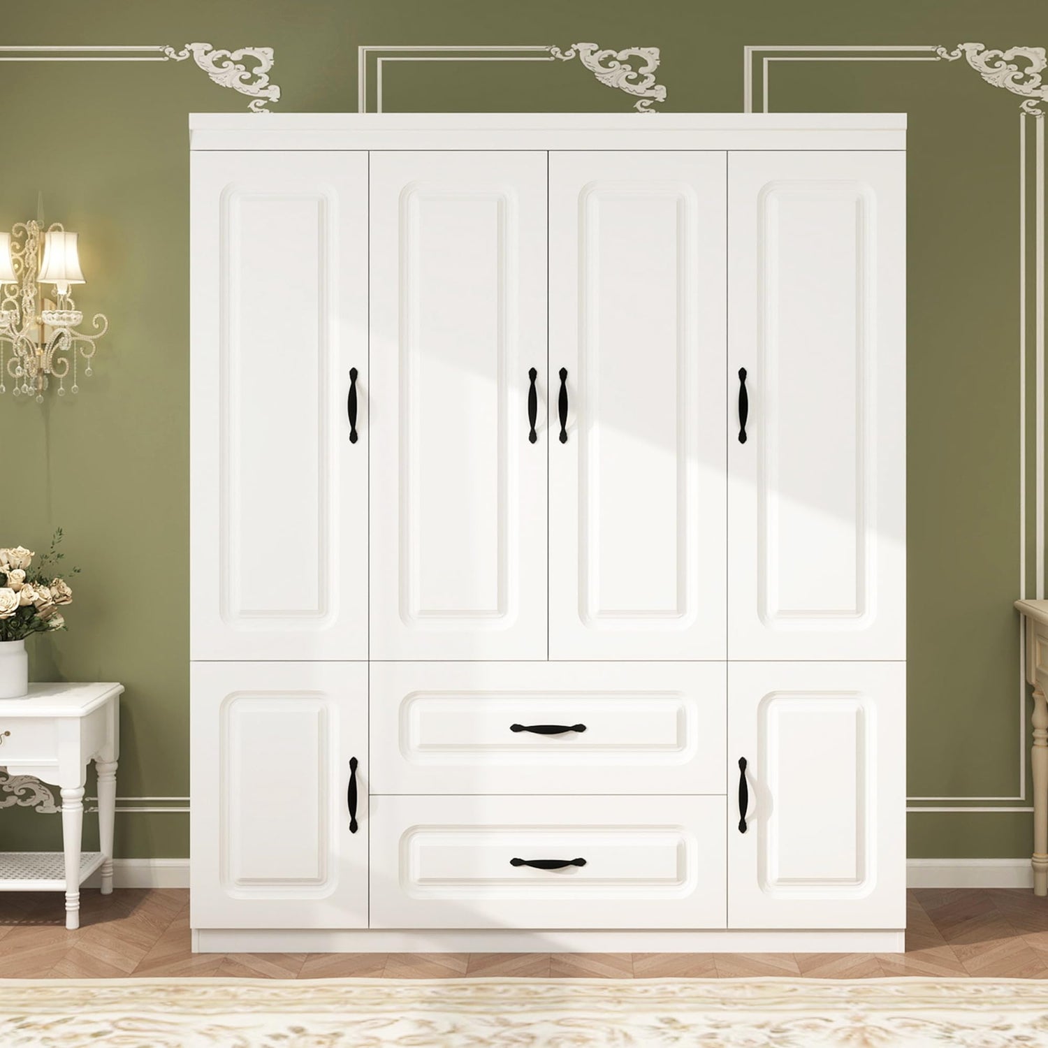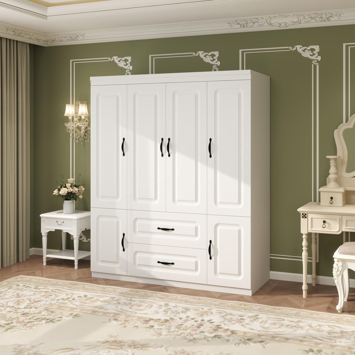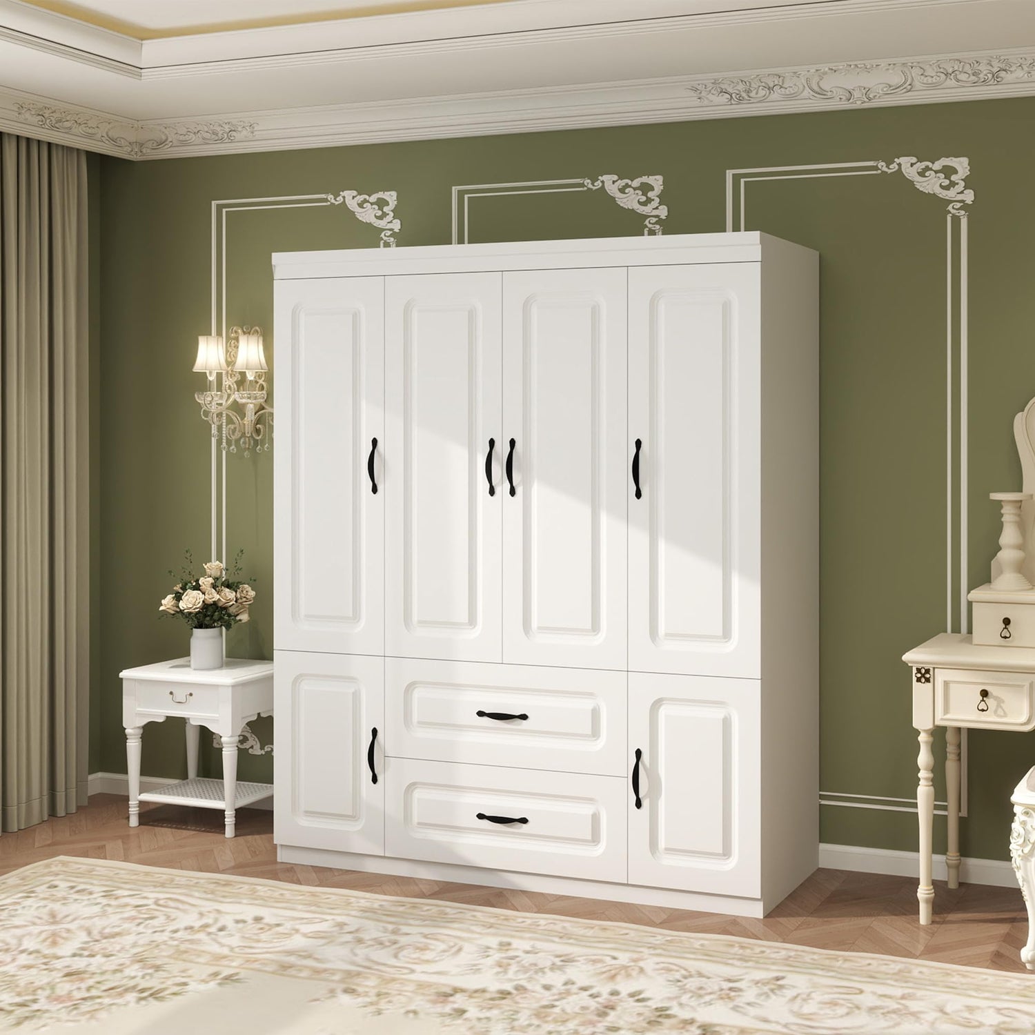 Keloyid Armoire Wardrobe Closet: White Wood Large Bedroom Armoires Wood Wardrobe Cabinet with 4 Door 2 Drawers Tall Closet with Shelves and 2 Hanging Rail Room