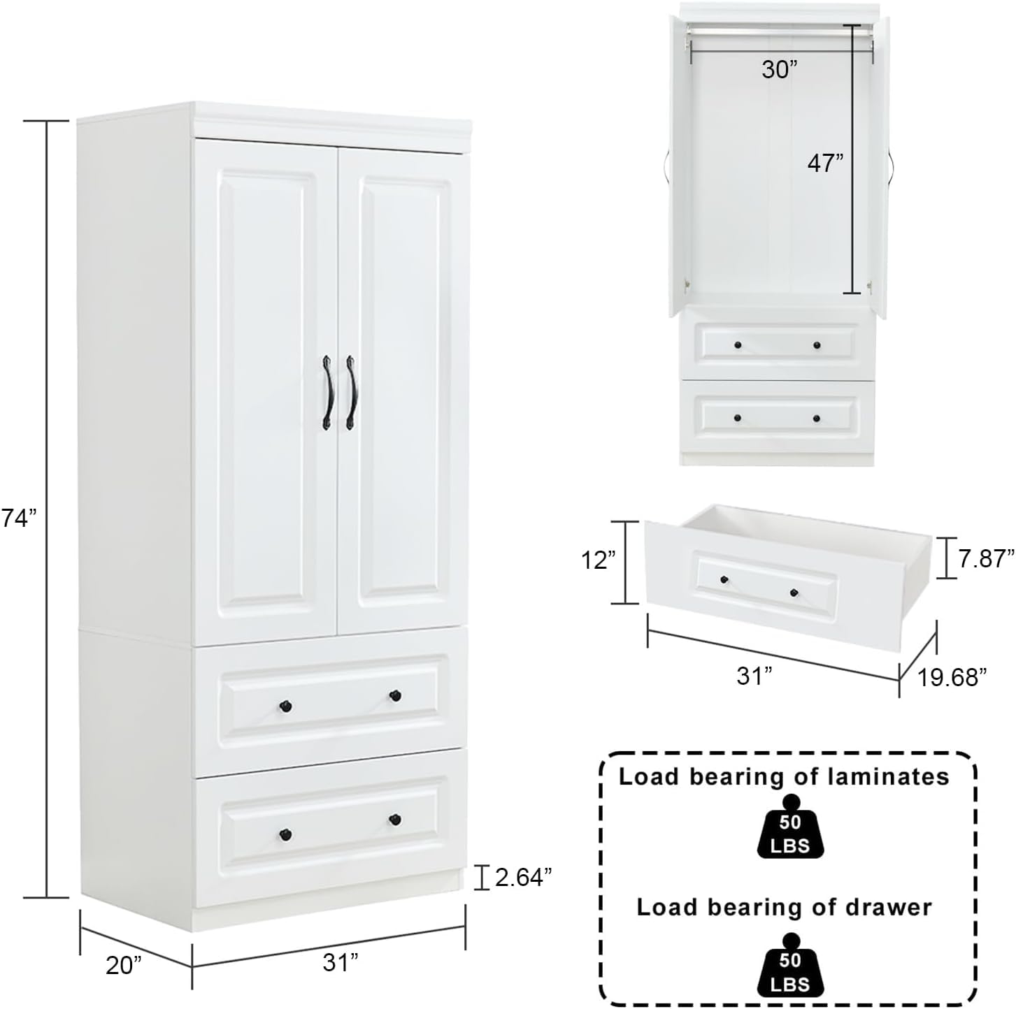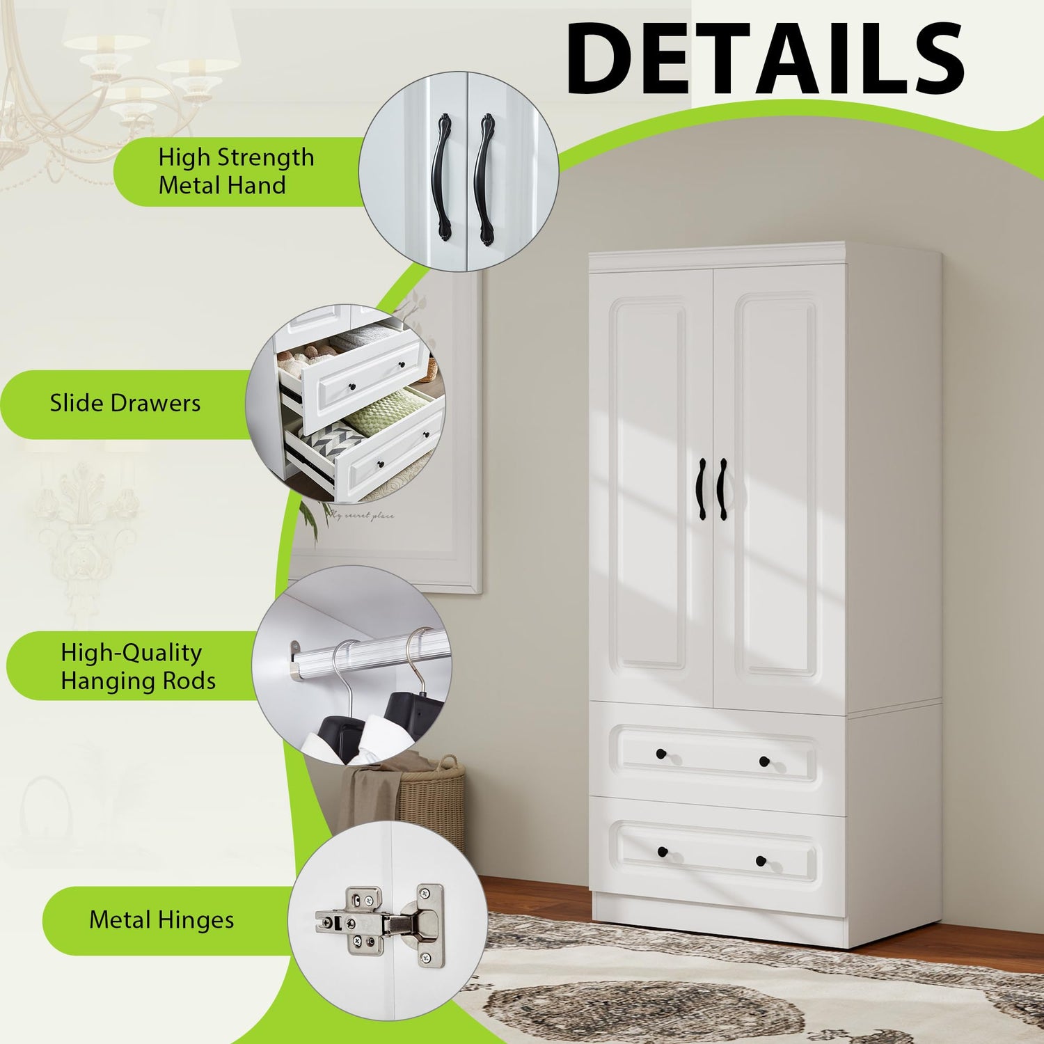 Keloyid Armoire Wardrobe Closet: Wood White Bedroom Armoire Storage Cabinet for Large Capacity with 2 Doors, Tall Armoire and Wardrobe Closet with 2 Drawers & Hanging Rail