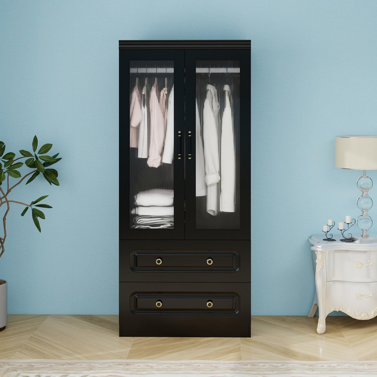 Keloyid Modern 2 Door Armoire Wardrobe Closet with Glass Door, 2 Drawers, Hanging Rod & Shelves, Black, 20.47 x 31.49 x 70.86 inches, Bedroom