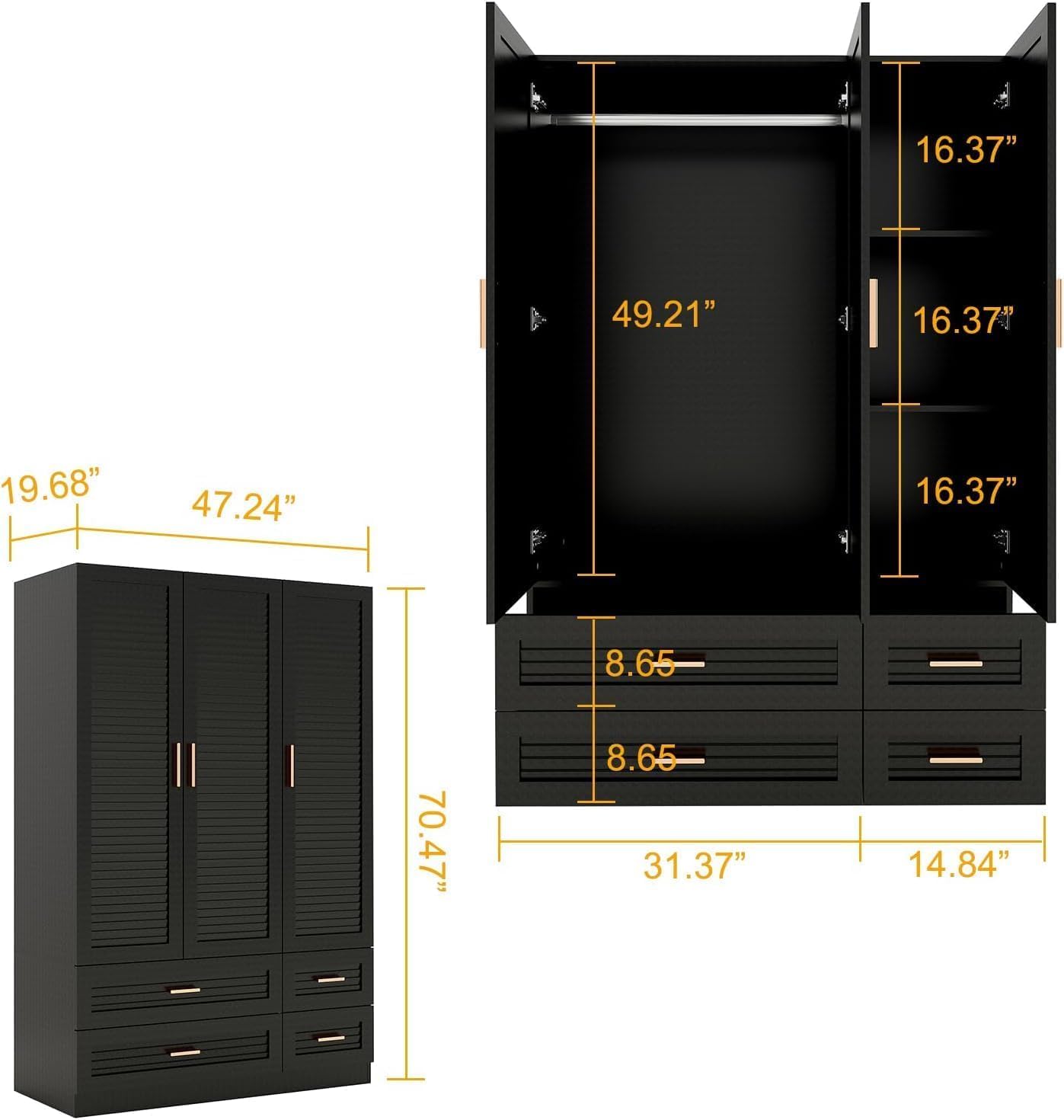 Keloyid Wood Armoire Wardrobe Closet Armoires Wardrobe Cabinet with 3 Door 4 Drawers Tall Wardrobe Closet Storage with Shelves and Hanging Rod for Bedroom Black 47.24''W x 19.69''D x 70.87''H