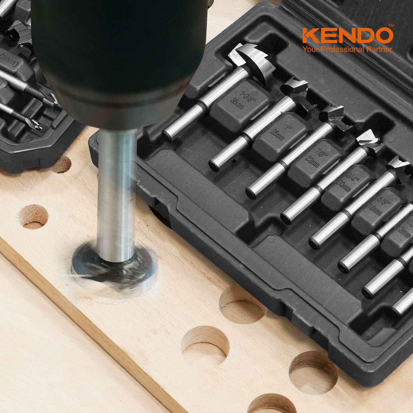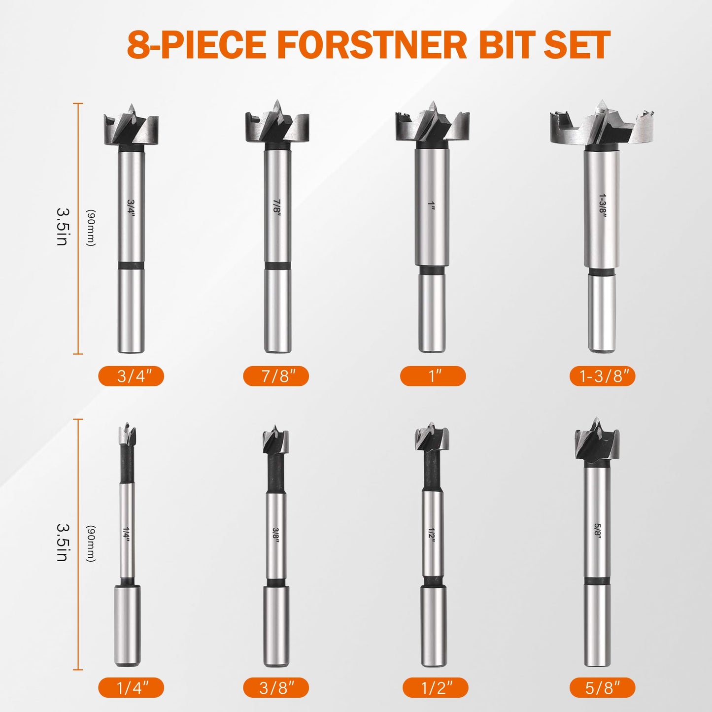 - SIZE: KENDO Forstner bit set includes: 1/4" (6.3mm), 3/8" (9.5mm), 1/2" (12.7mm), 5/8" (15.8mm), 3/4" (19.0mm), 7/8" (22.2mm), 1" (25.4mm), 1-3/8" (34.9mm) Forstner bits.
