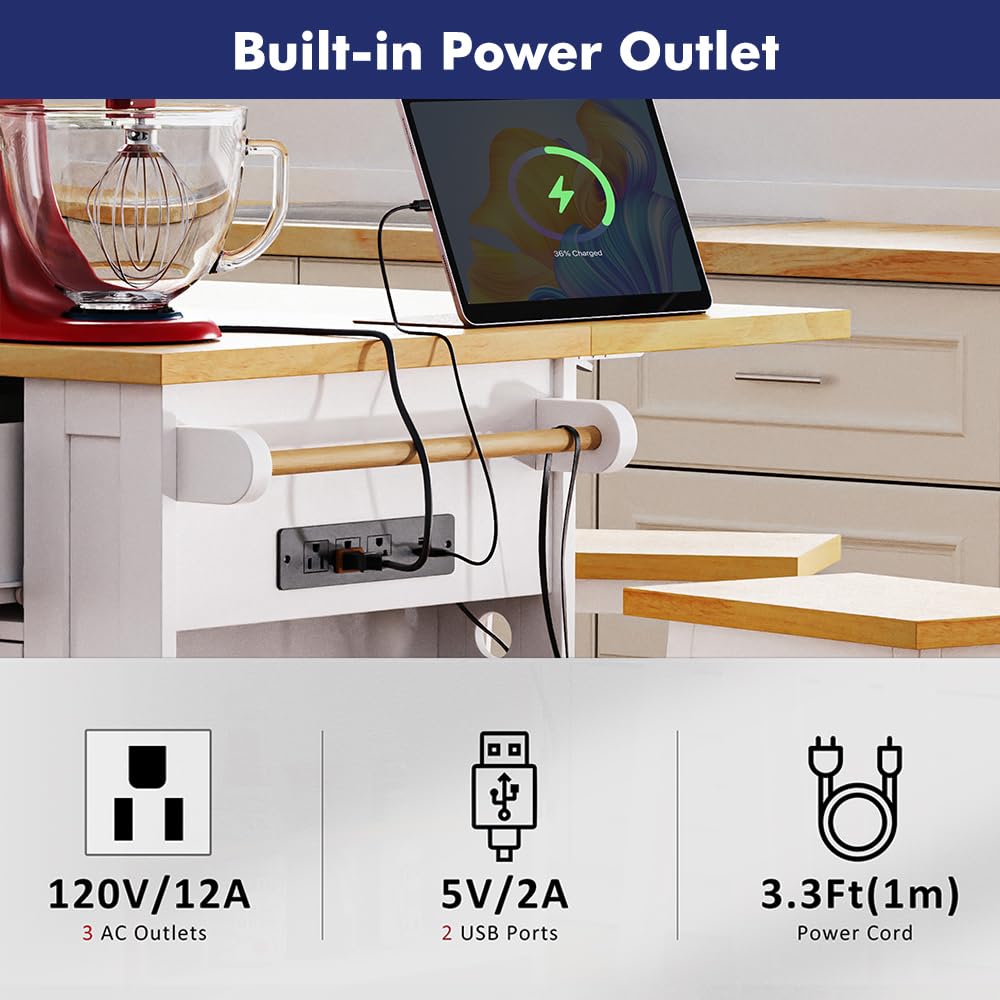 - Power Supply - - This elegantly designed kitchen cart includes a sophisticated built-in charging station, featuring 3 AC outlets and 2 USB ports to effortlessly meet all of your kitchen appliance power requirements. You can conveniently charge your coffee maker, juicer, and toaster on the countertop of this kitchen storage island.