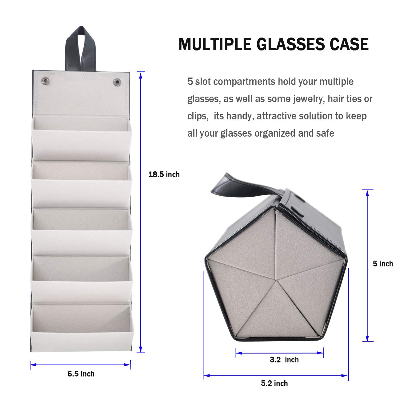 - 5 Slot Compartment eyeglass holder - this sunglasses storage organizer can hold up your 5 pair glasses or other stuff in there as well, like some jewelry, hair ties or clips, watches, it is great to place on the dresser or closet shelf, handy to had your sunglasses to match each suit