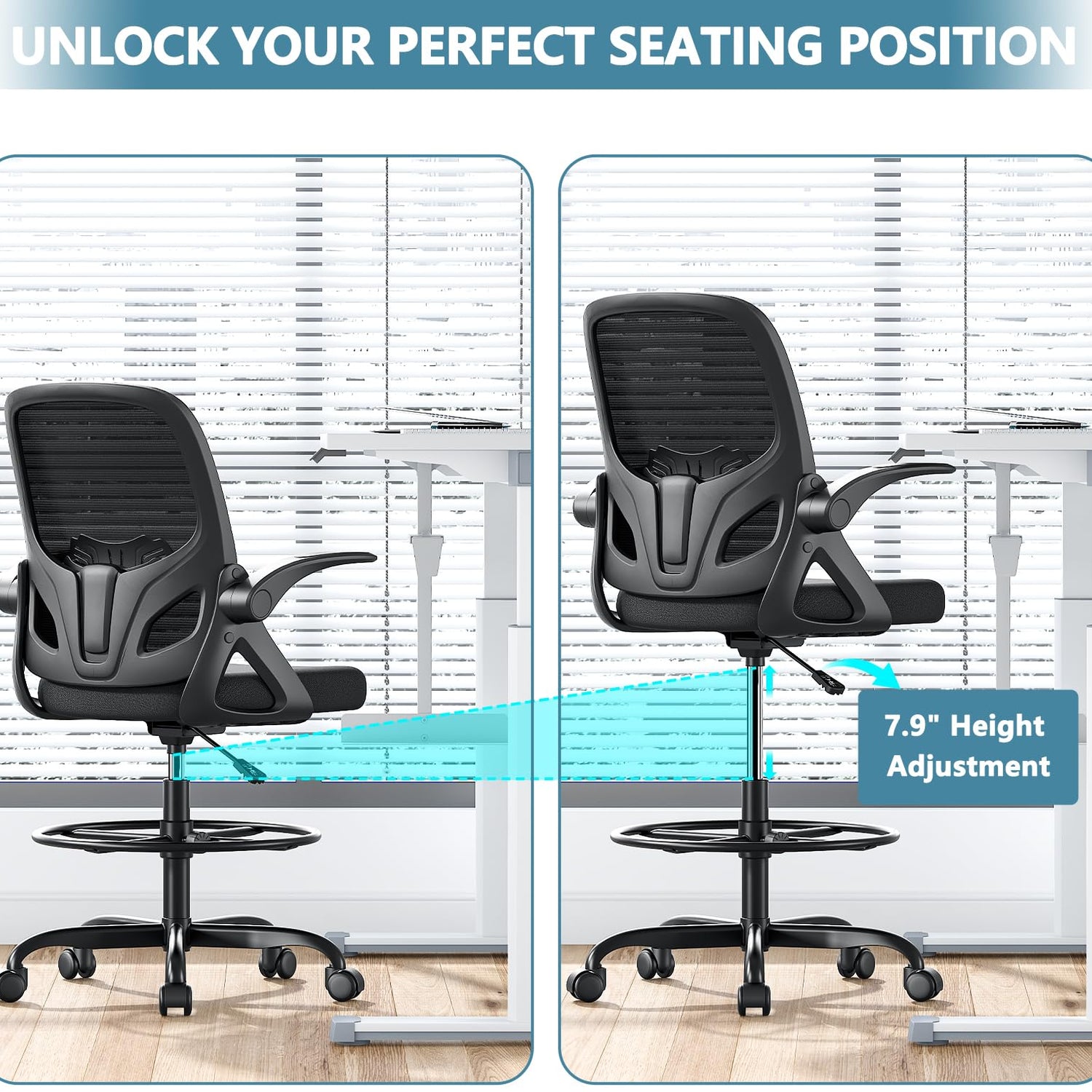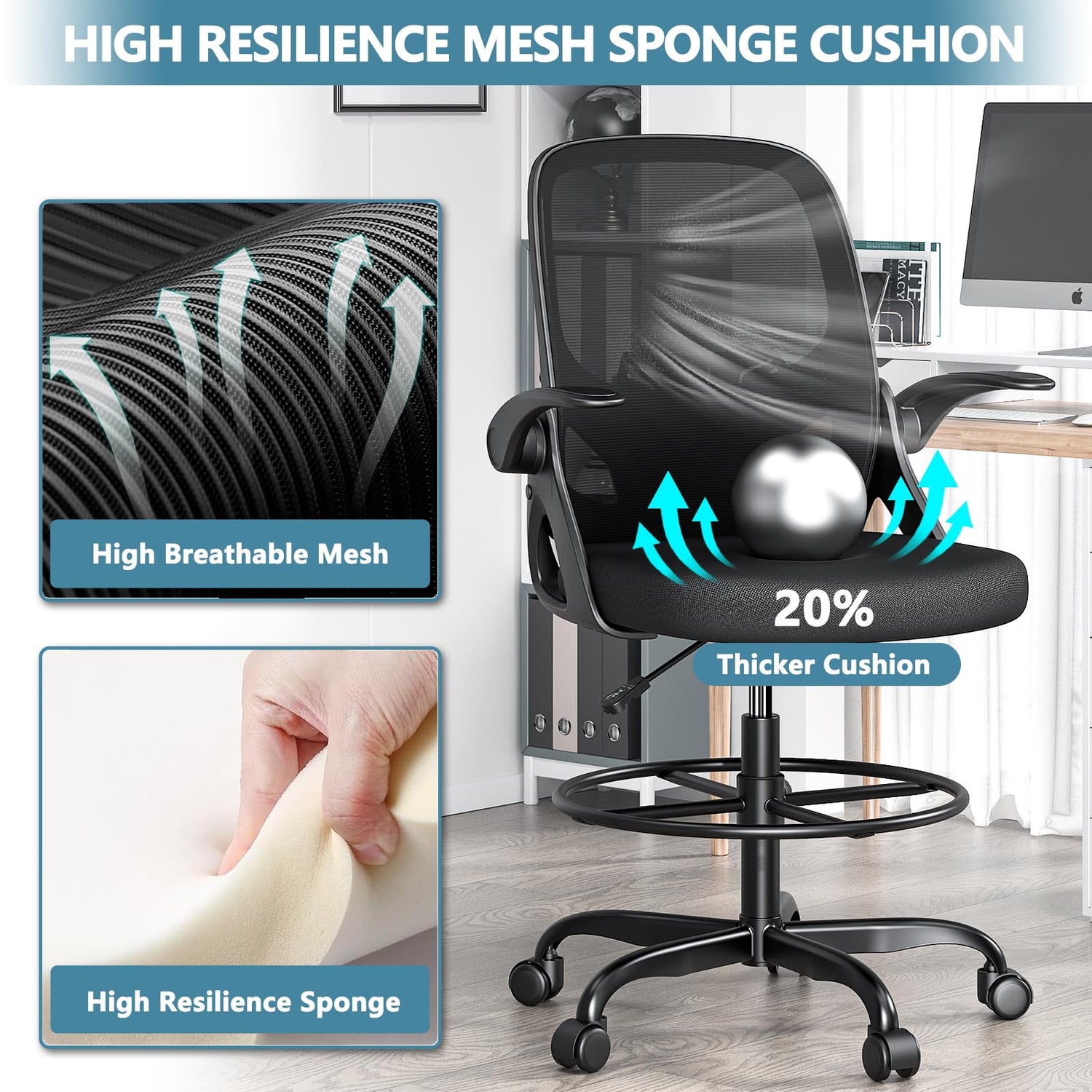 Kensaker Tall Drafting Chair with Footrest Ring for Home and Work, Ergonomic Home Desk Office Chair with Flip up Arms and Lumbar Support, Tall Extended Height Executive Home Desk Office Chair(Black)