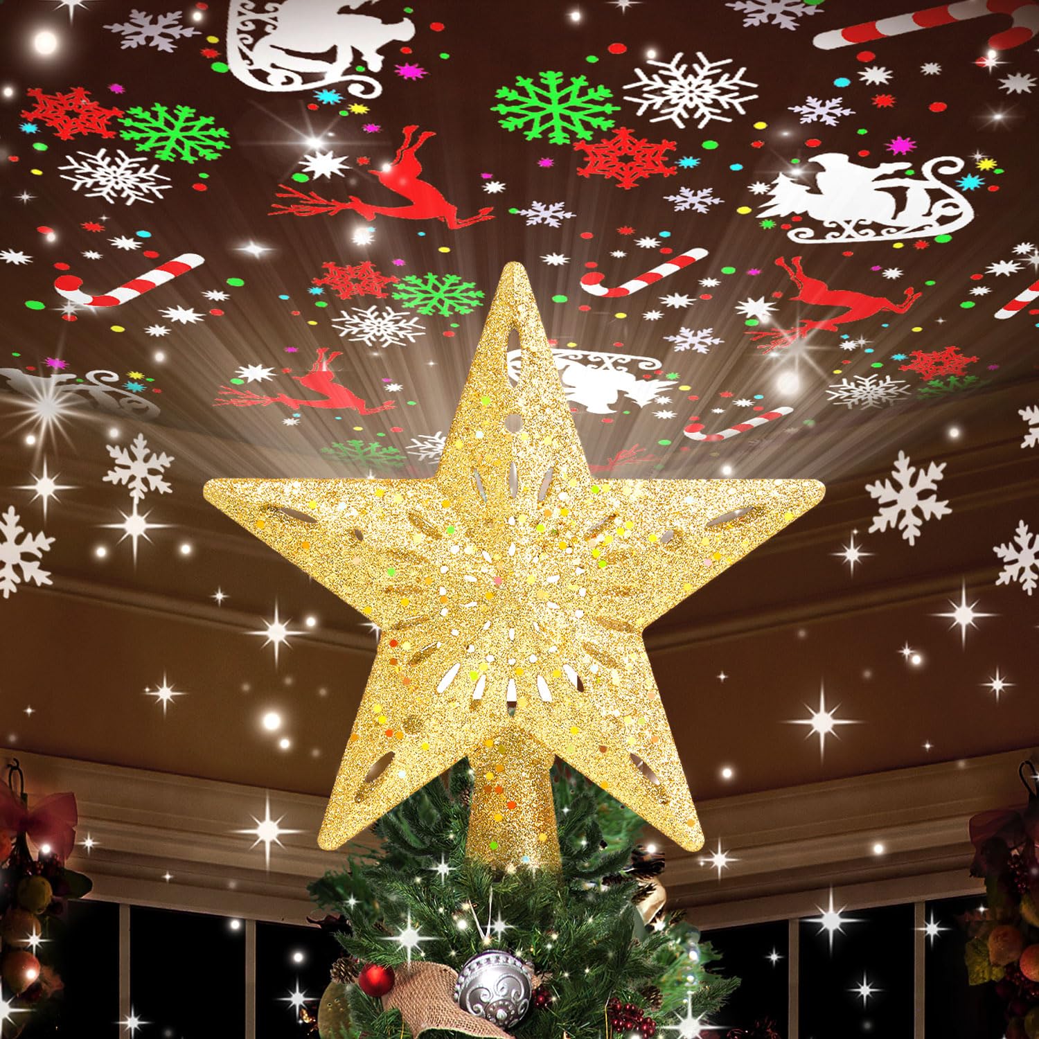 - Magic 3D Rotating Projector: Gold christmas tree star topper projector with 3D hollow design, classic pentagram look design with glitter gold powder slight fall of glitter is normal. Decorate the top of your Christmas tree with projected patterns swirling and dancing on the ceiling to make your Christmas impressive