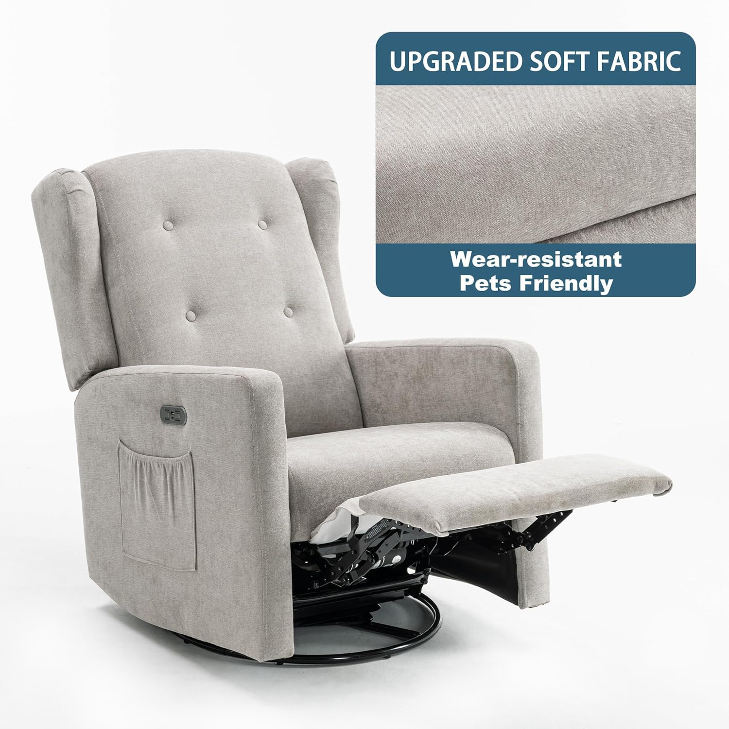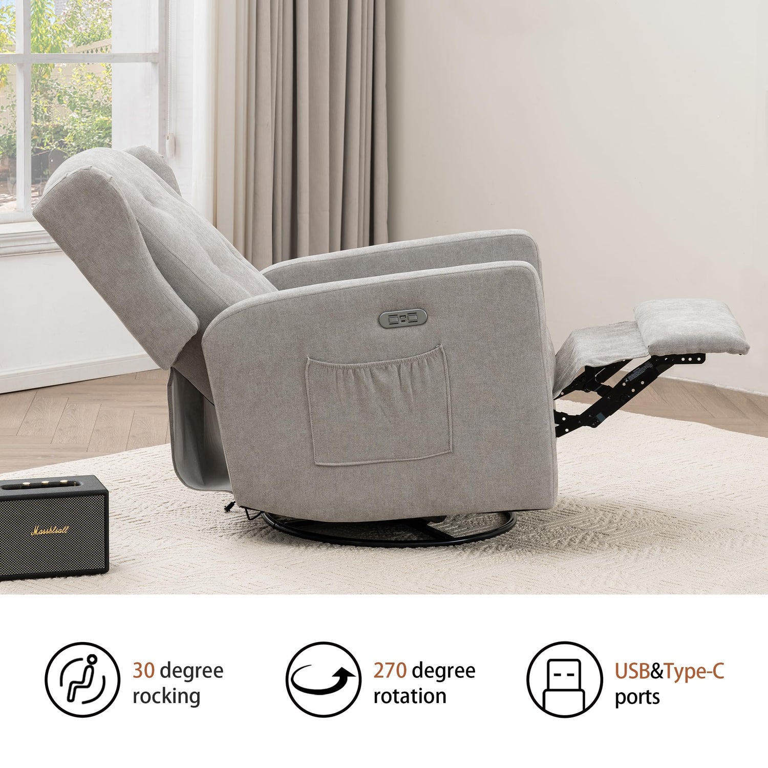 Ketaiyou Power Swivel Rocking Recliner Chair, High Back Electric Rocker Nursery Glider Chair, USB and Type-C Ports, Upholstered Fabric Reclining Single Sofa Chair for Living Room (Grey)
