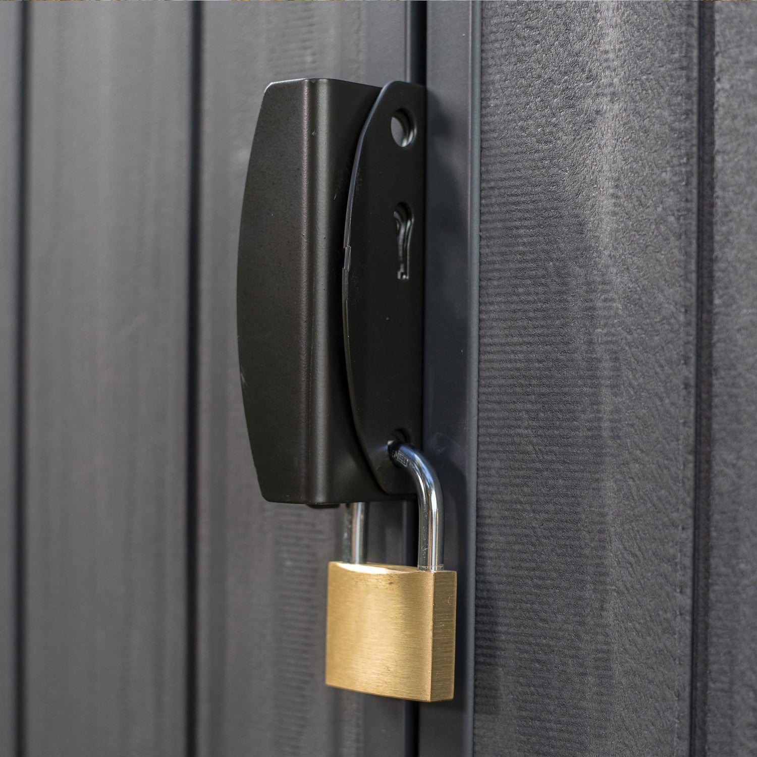 Details: Declutter your garage and improve outdoor storage with the Keter Darwin 4 x 6 Foot Outdoor Storage Shed for Garden Accessories and Tools. Designed with polypropylene plastic, this durable resin shed is weather-proof. Just spray the exterior clean with a hose as needed. The included side window allows plenty of natural light to enter the shed, making all the contents easily visible. The spacious and well-lit interior also features a ventilation grille that retains fresh air and protecting all your garden accessories. The tongue and groove construction makes assembly easy and doesn't require any special tools. Declutter your space with additional shelves (shelves not included) if you want to store your paint, jars, or bags of potting soil. Ready for any inclement weather, this durable shed is equipped with heavy-duty floor panels create a sturdy foundation and provide stability during inclement weather perfect for your patio, garden or backyard. For ample space and durable storage, invest in the Keter Darwin 4 x 6 Foot Outdoor Storage Shed for Garden Accessories and Tools. With this Keter Outdoor Storage Shed you can add more storage to your backyard, garage, or workshop with this easily assembled home essential.