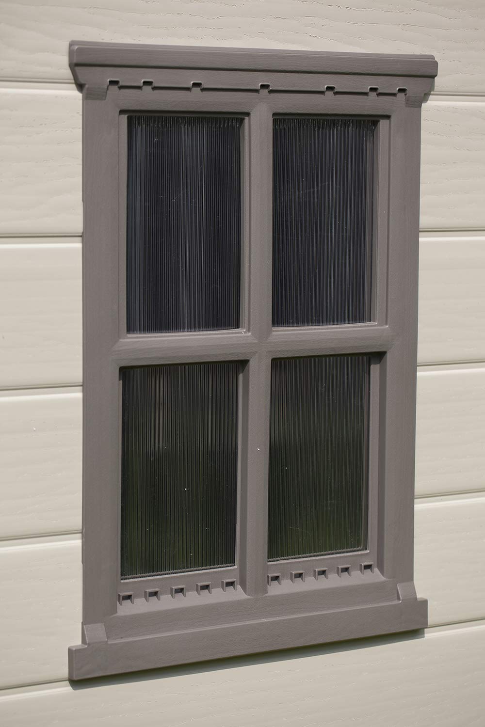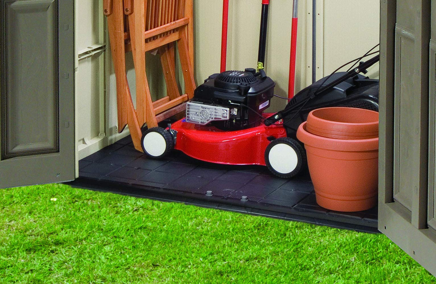 Details: To keep the elements at bay, the Keter Factor shed is made of a strong and durable resin. This material is not only weather-proof, but it is also resistant to rot, rust, and dangerous UV rays. The exterior of this shed will never fade, unravel, or require any sort of maintenance from you. The surface is easy to clean and will remain looking like new for a long time. You'll never have to worry about repainting the outside or inside of the Factor. This low maintenance storage shed is perfect for any backyard. Key Features: Exterior dimensions: 100. 5 in. L x 101 in. W x 95. 5 in. H Interior dimensions: 93 in. W x 93. 5 in. D x 94 in. H Storage capacity: 420 cu. Ft. Floor weight capacity: 30 PSF Roof Weight capacity: 15 PSF Stylish wood-like texture in neutral colors to complement any home Made from polypropylene resin plastic & steel reinforced to ensure durability Skylight & Window to let in natural light Vented for air circulation Lockable latch (lock not included) High arched wide double doors Sturdy floor panel Included 2 shelves with brackets Weather-resistant, waterproof and UV protected Will not peel, rot or rust Never needs painting